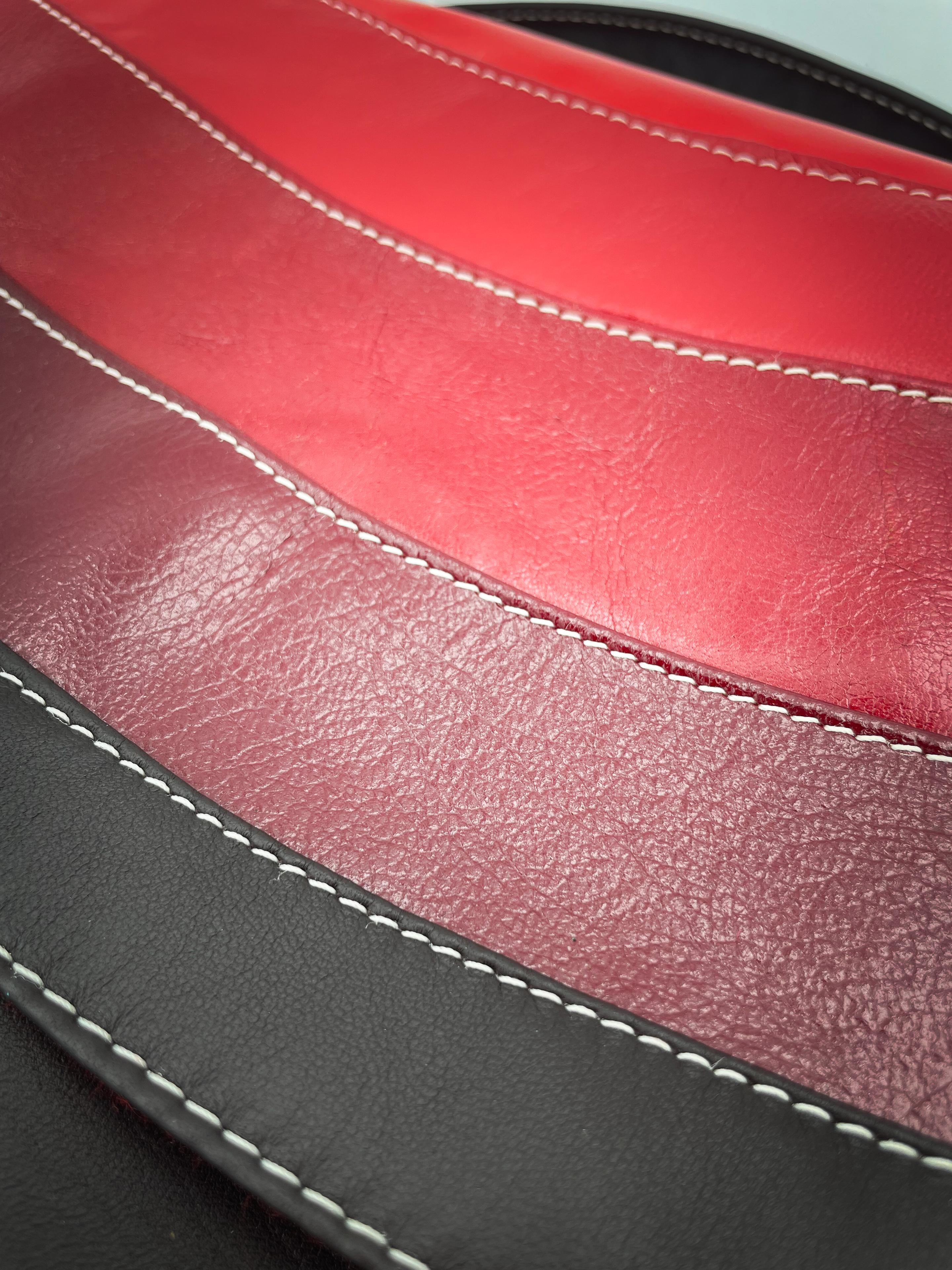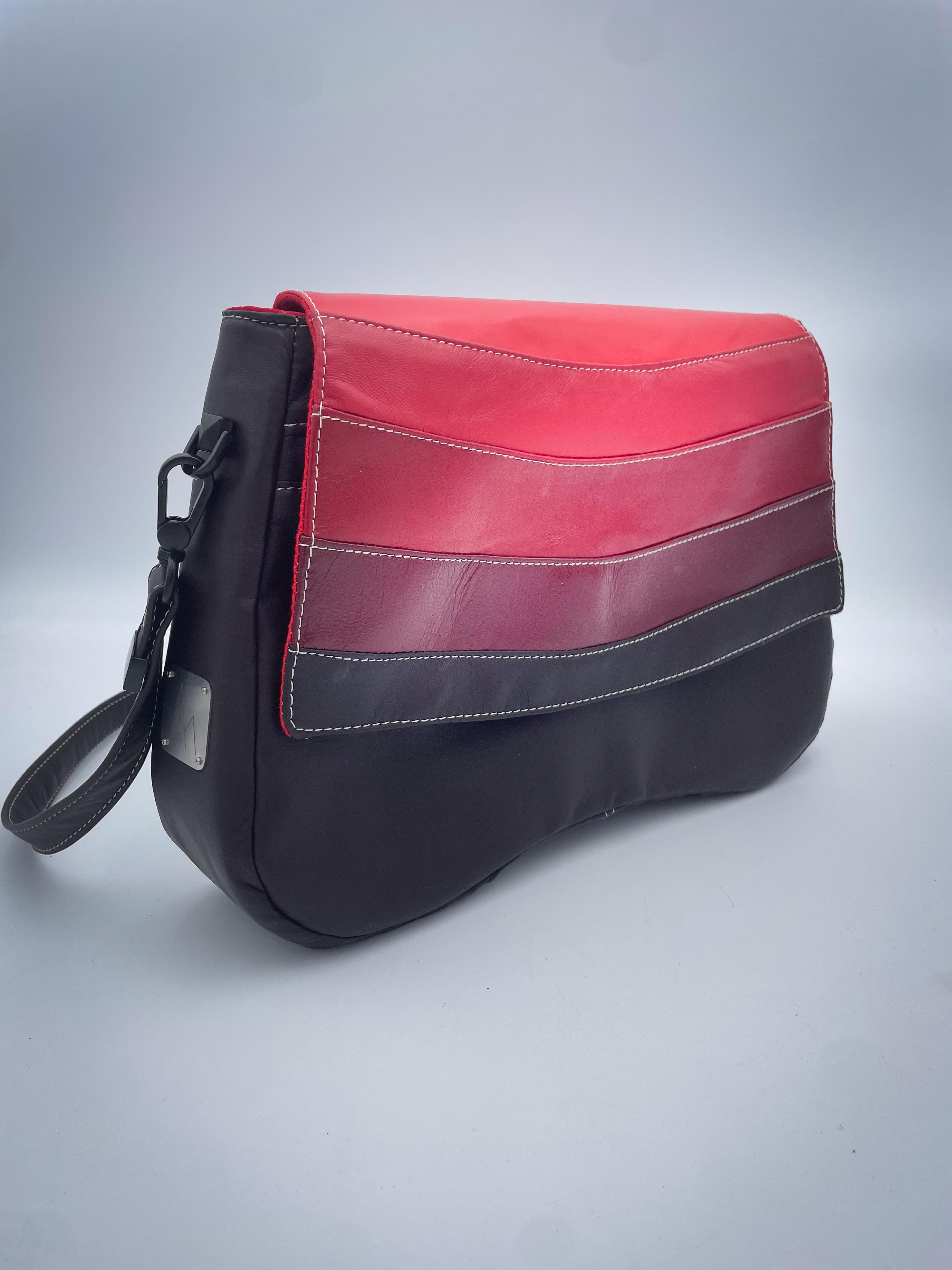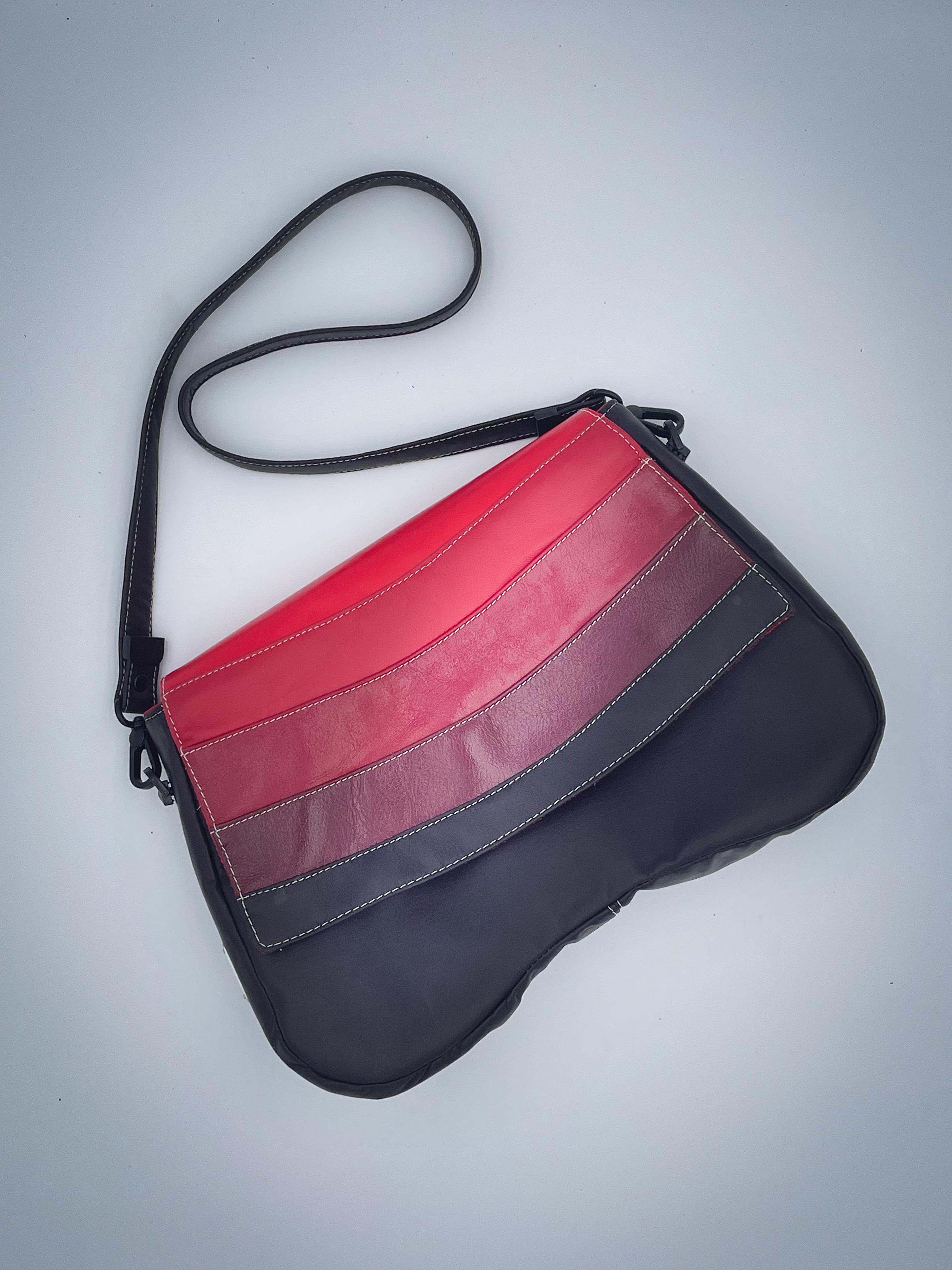 Crossbody bag made from reclaimed high-end leathers, polyester satin and cotton canvas.