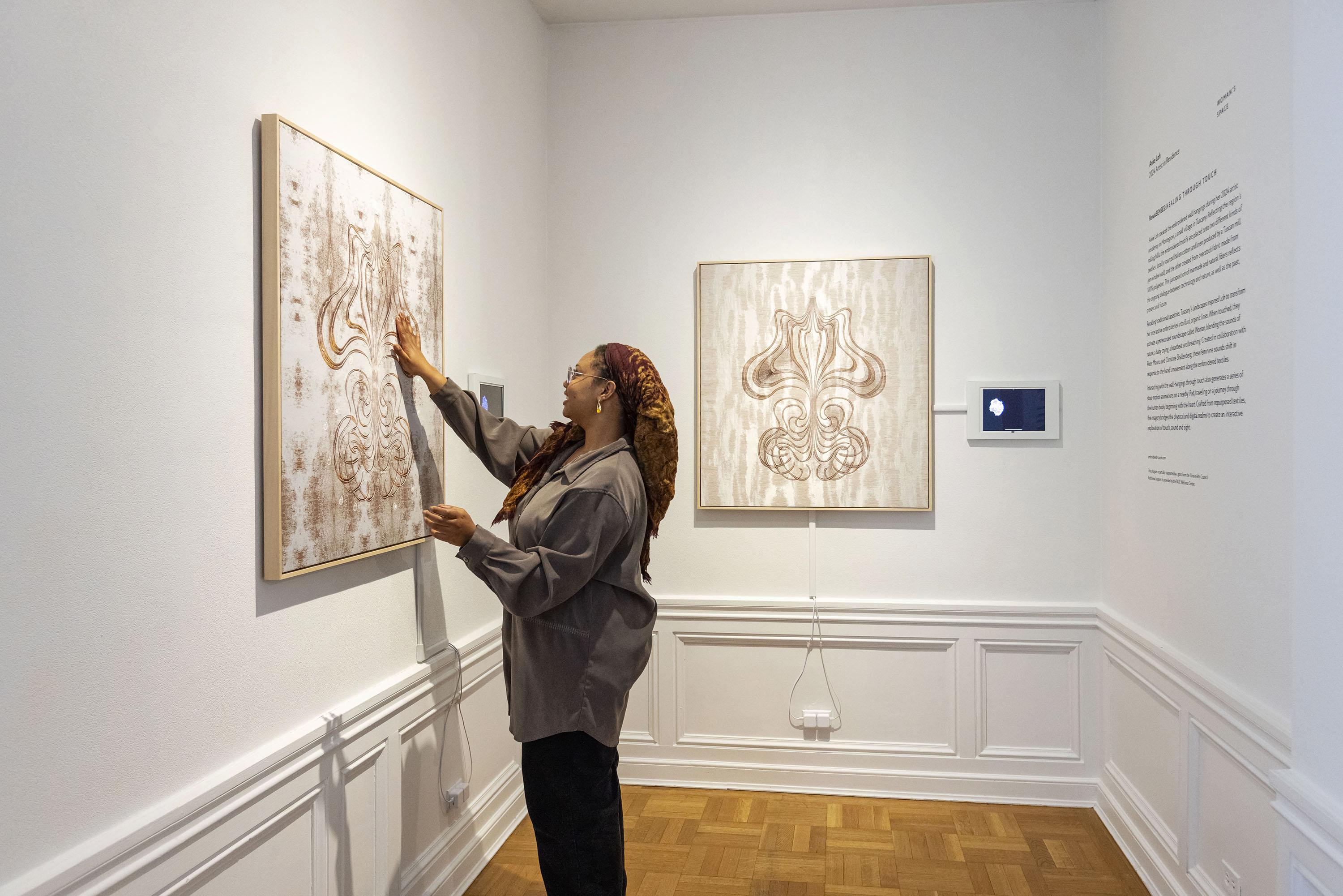 Photo: Capacitive embroidery activates layered soundscapes and visualisation. Framed touch-sensitive textiles installed