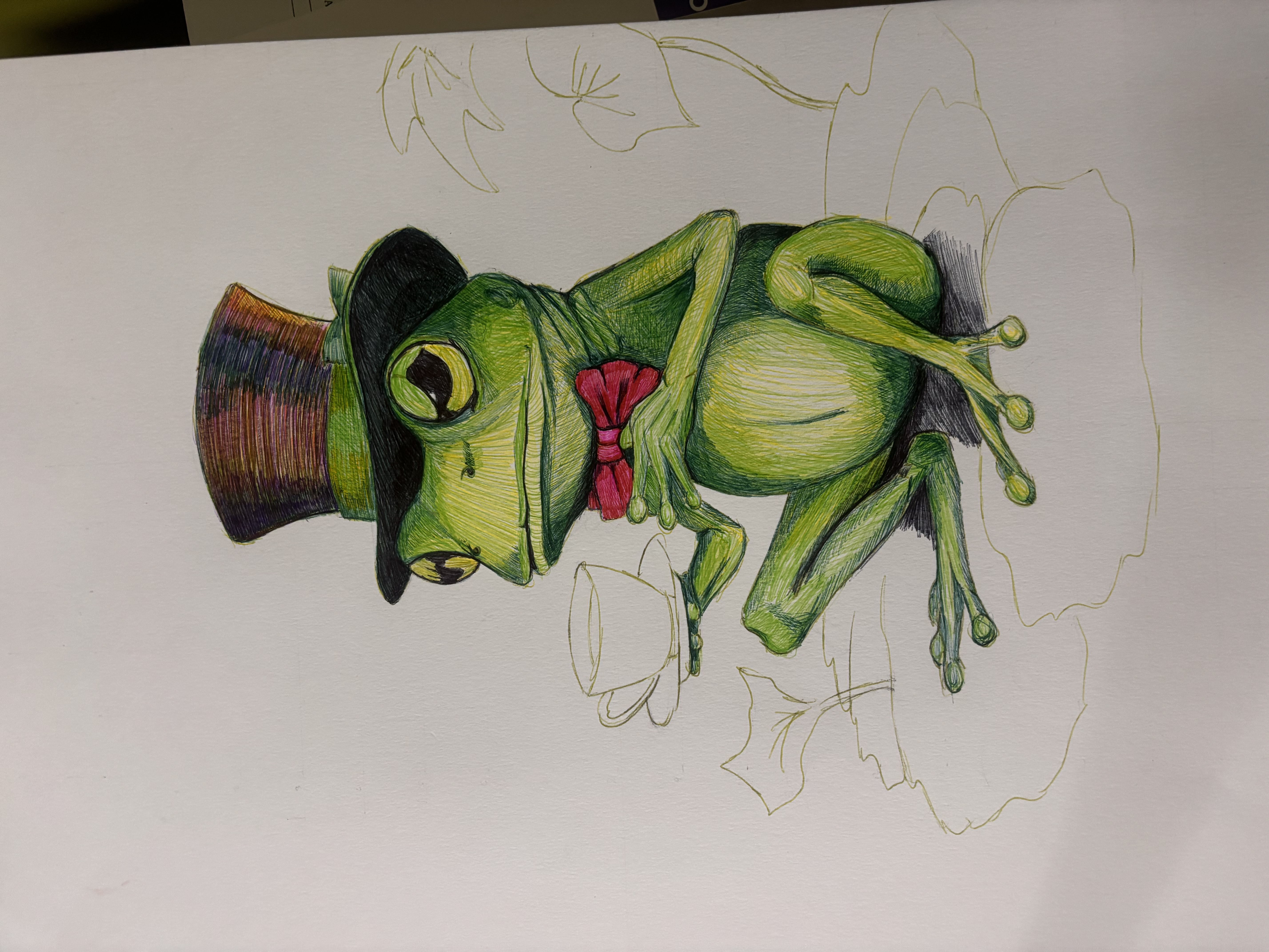 With a blend of refined humor and technical mastery, this work depicts a frog with human gestures, sipping tea like a Victorian gentleman. Seated on a lotus leaf and surrounded by a stylized natural setting, the figure satirizes social norms by inserting the wild into a high-culture scene.