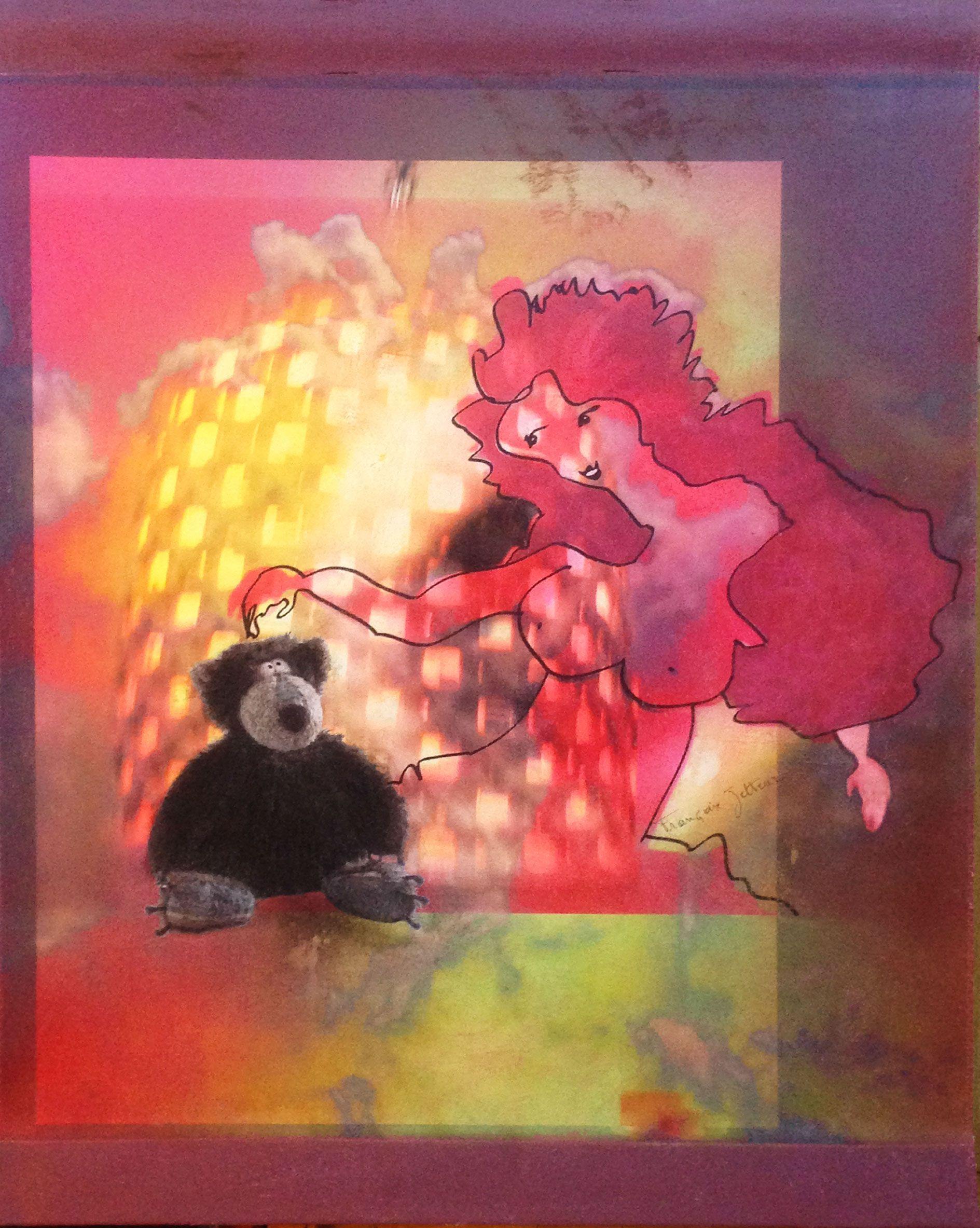 Le dessin sur papier est importé dans l’ordinateur, agrandi et mis en couleur en incorporant parfois des photos, des textures. L’impression sur différents supports est souvent retravaillée.