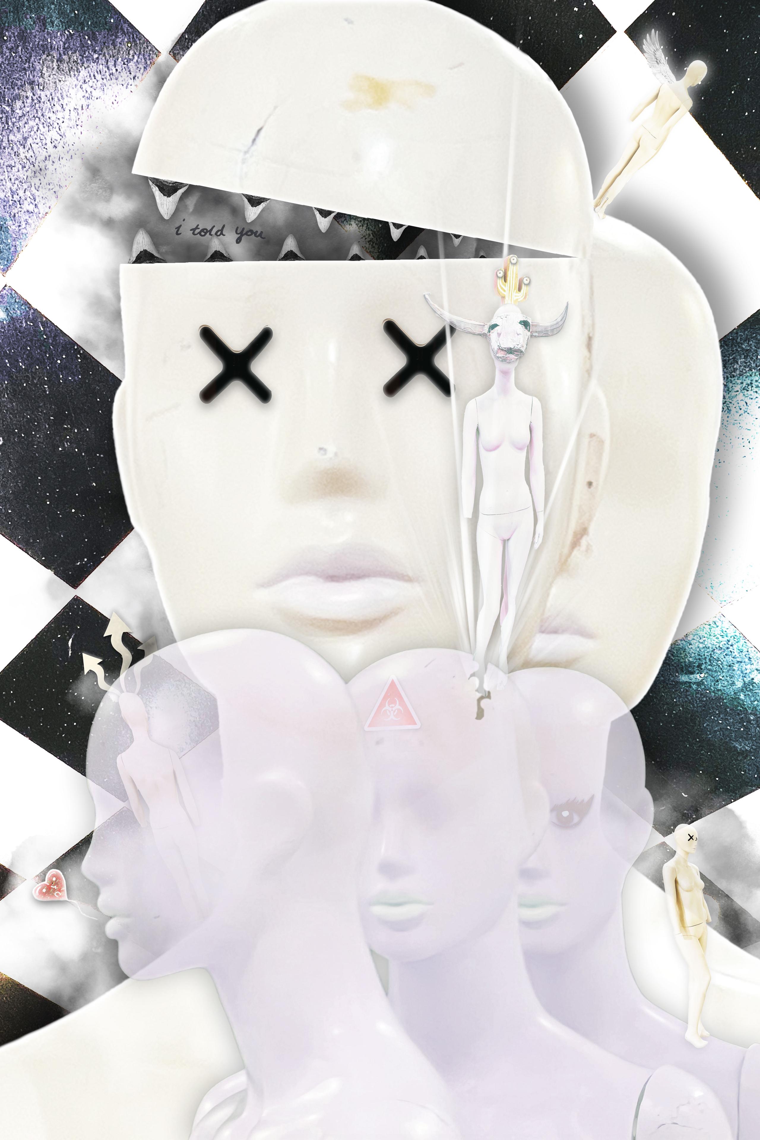 “Mannequin Dreams” is a surreal digital collage that drifts through the fractured subconscious of artificial beings. Built from layered photography, sculptural mannequins, and hand-cut symbols, the work visualizes a psychic realm where identity splinters and plastic bodies dream of something more than display. Ethereal heads multiply across a stark checkerboard void, whispering secrets of consumer anxiety, self-erasure, and collective delusion.