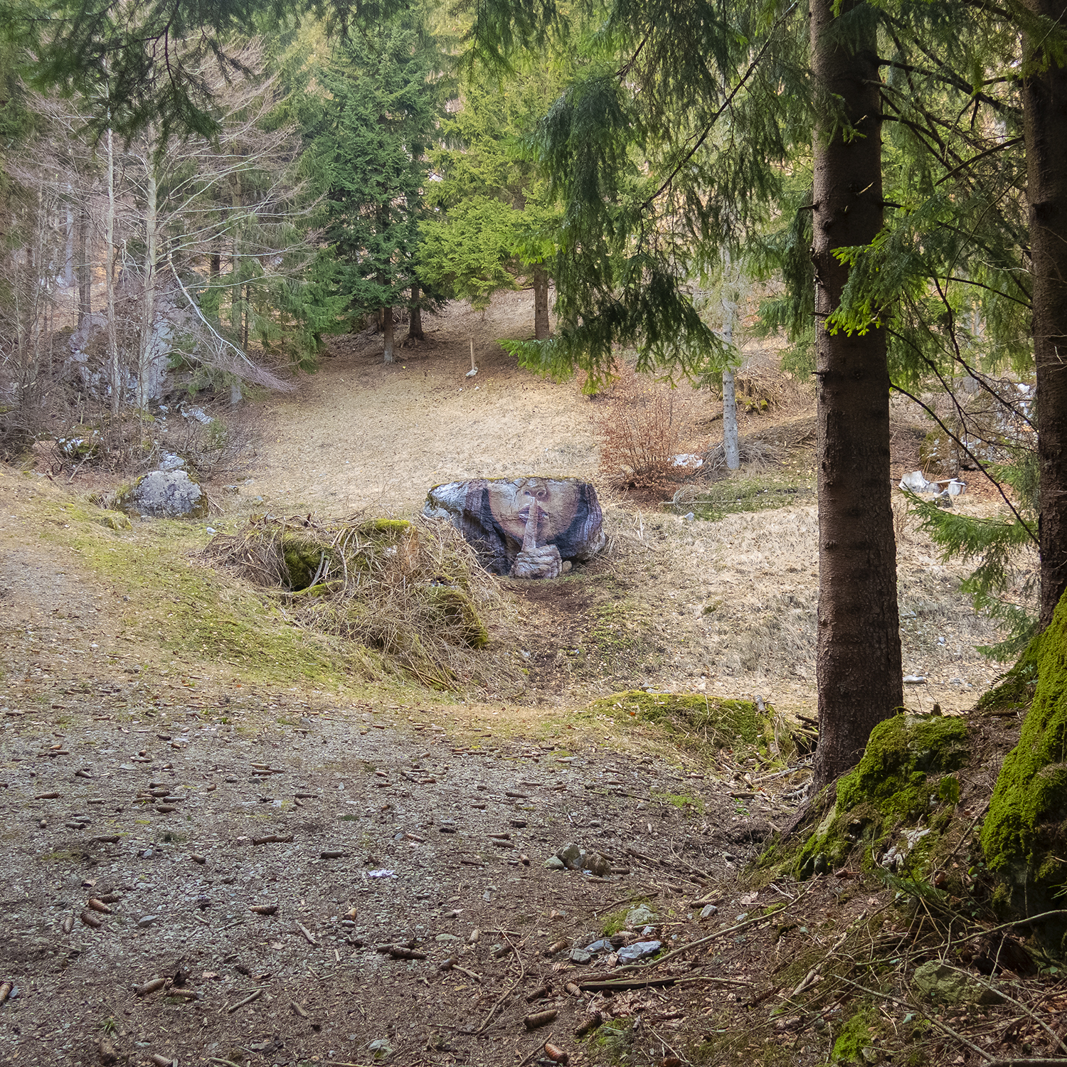 Painting on a rock contains a girl gesticulating to be silent. Being placed in the forest meadow about 30m from the main road it represents the contrast of fuman sounds (traffic) versus the sounds of the nature. It is a part of the series with 'Look!' and 'Listen!'