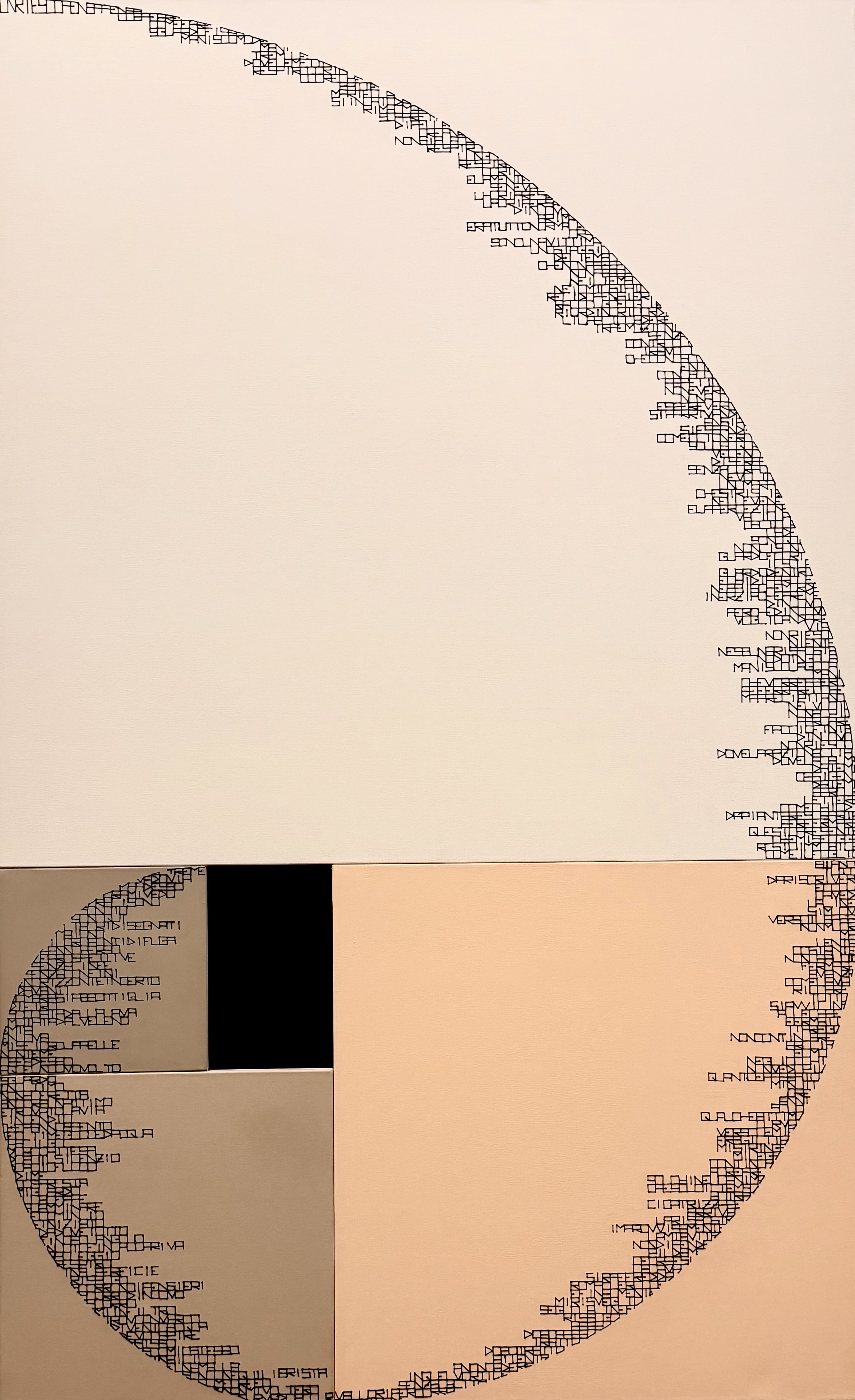 "1.618 Breaths" isn't just a work to be looked at, but to be read, followed, and listened to/undertaken. It unfolds across four square canvases, which emphasize the constructive geometric forms of the golden spiral. This harmony and beauty of an ancient symbol become a metaphor for how appearance can be misleading. Here, the spiral transforms into a vortex. It's a movement that pushes and urges, tightening its grip on the observer who chooses to resonate in unison with the "1.618 Breaths" of the verses' rhythm, in an emotional or conceptual harmony.