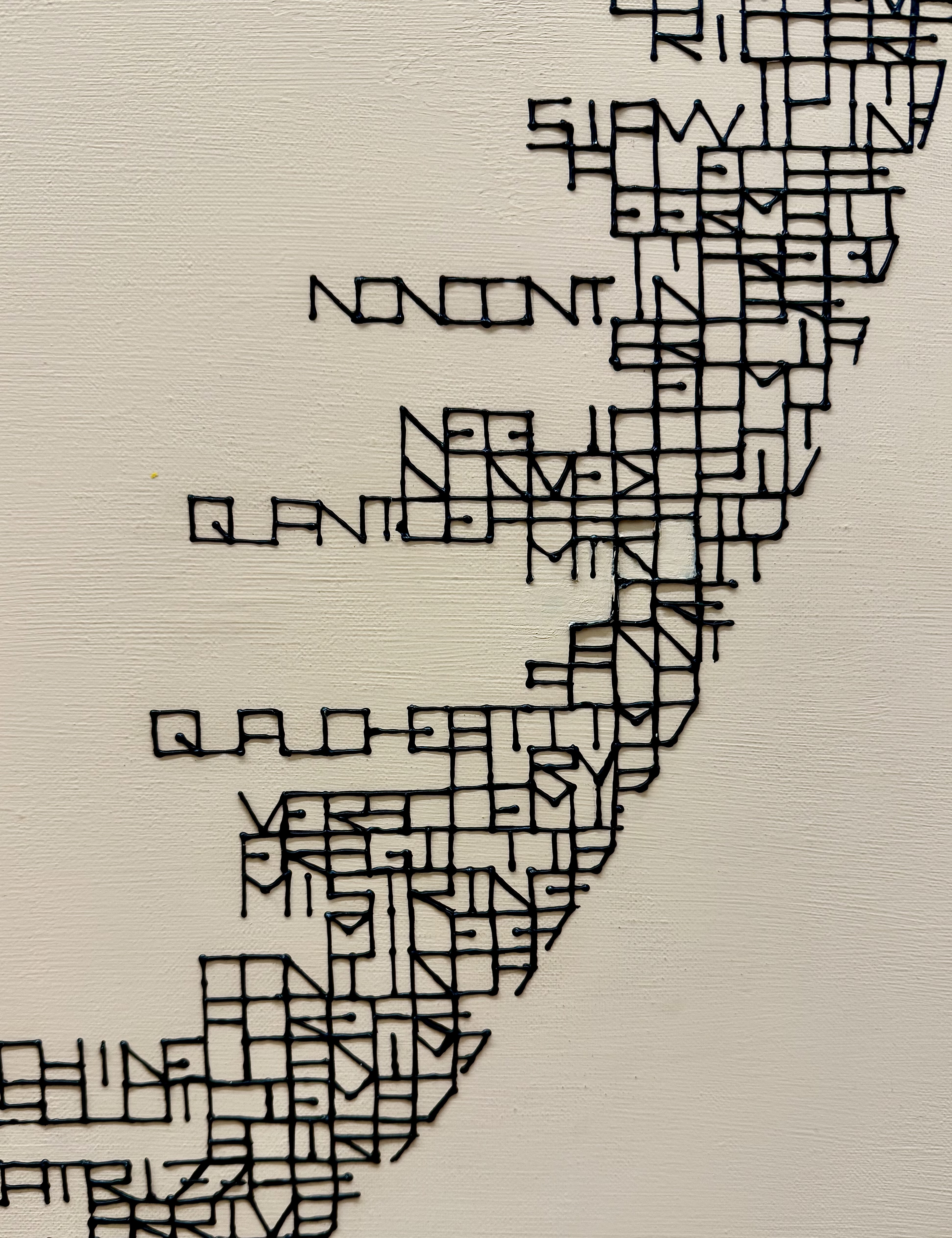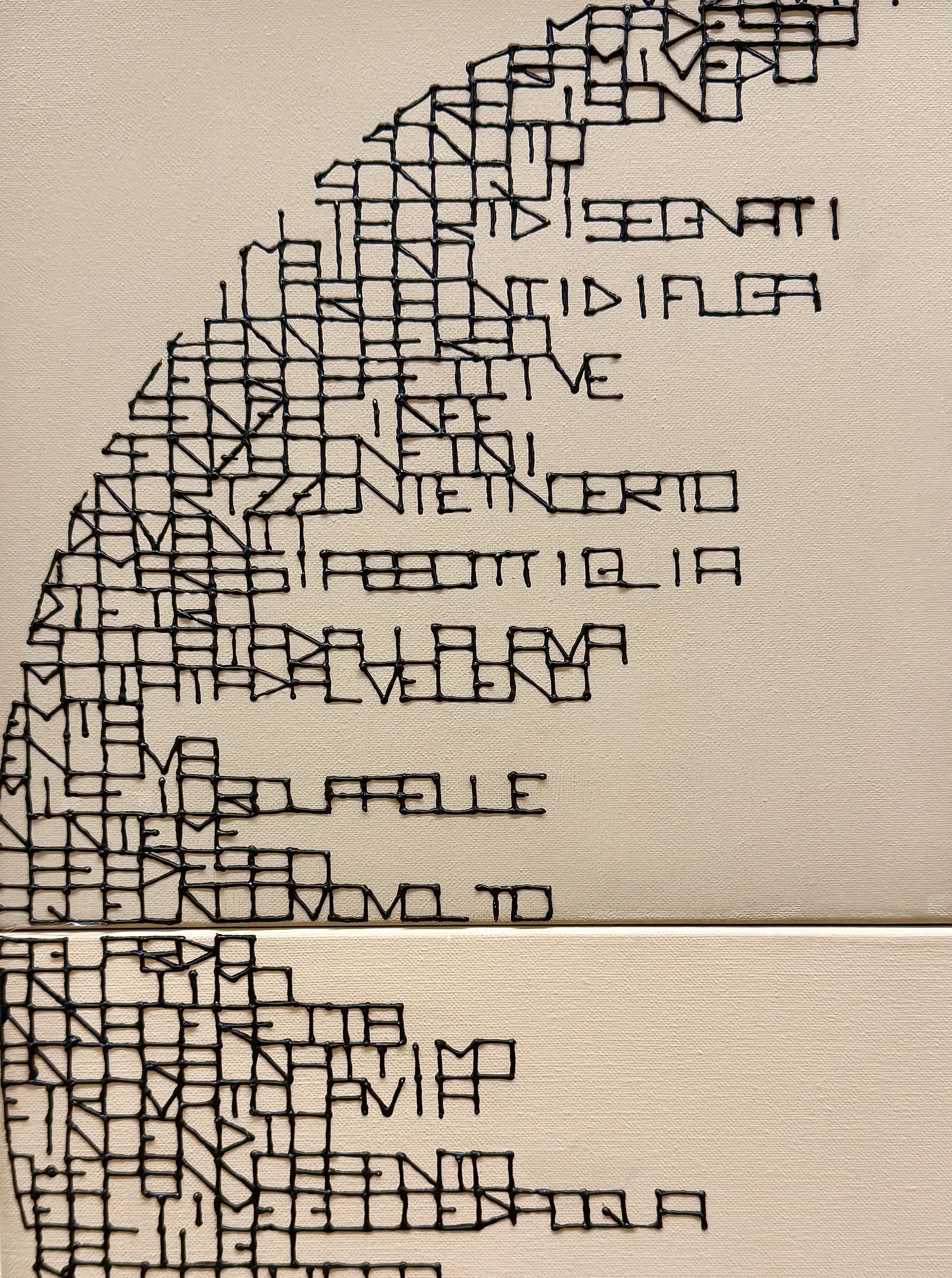 In moments when anxiety overwhelms, the mind blurs and nothing seems comprehensible. This is mirrored in the work's verses, where the letters, in their new form, lose the coding that allows their meaning to be clearly deciphered, creating a visual disorientation that reflects inner bewilderment. The letters are close-set, black, textured, and dense, like the weight of thoughts compressed in the mind, pressing on the temples.