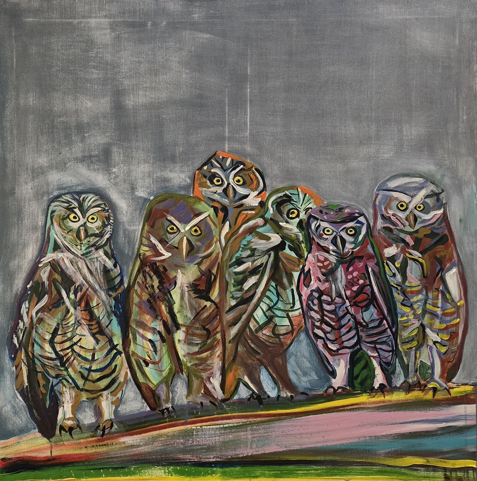 This painting is part of a series about owls. The owl project is about us, about people. About our complex personalities, opinions, and community. You can find yourself in the reflection.