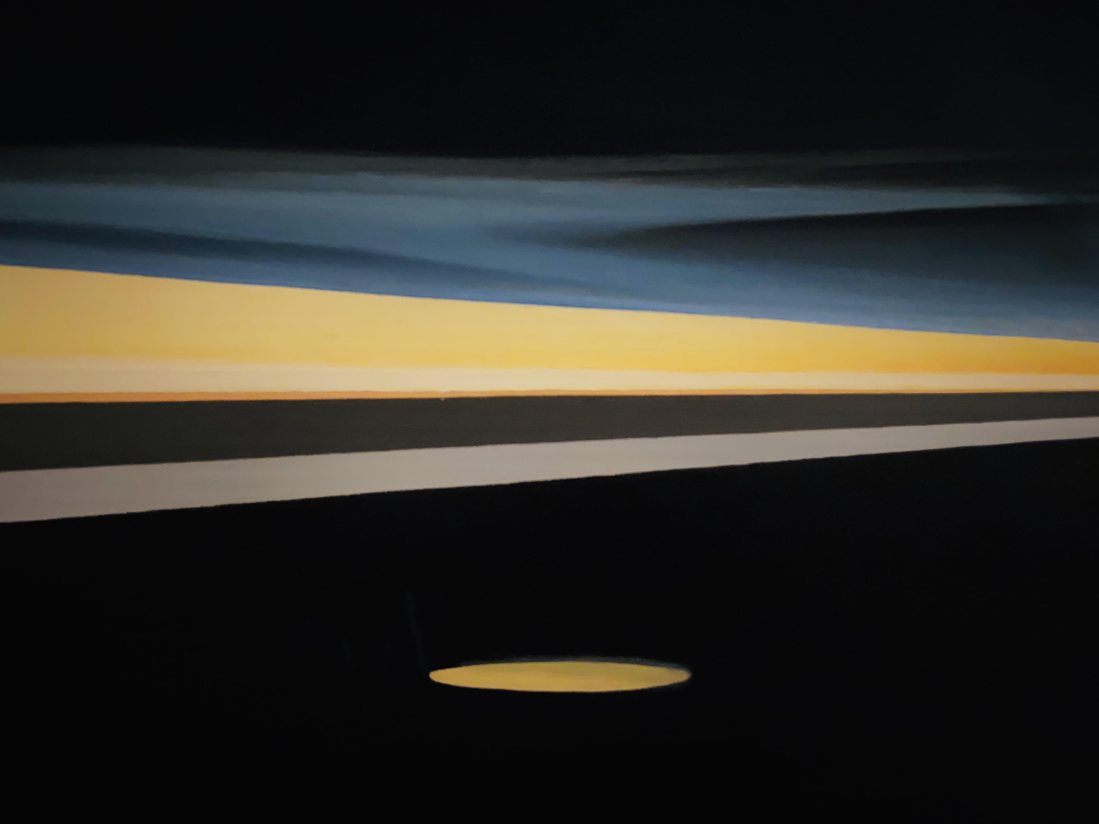 Below the cliff, a sharp triangular form simplifies the outline of a friend’s vehicle. Its presence is not merely literal but symbolic, grounding the scene in the memory of that particular day, its story, and its setting. In the distance, a lighthouse appears near the vanishing point of the perspective. Though far from the hotel on the cliff, it serves as a quiet guardian of the horizon, a reminder of guidance and hope in times of obscurity.