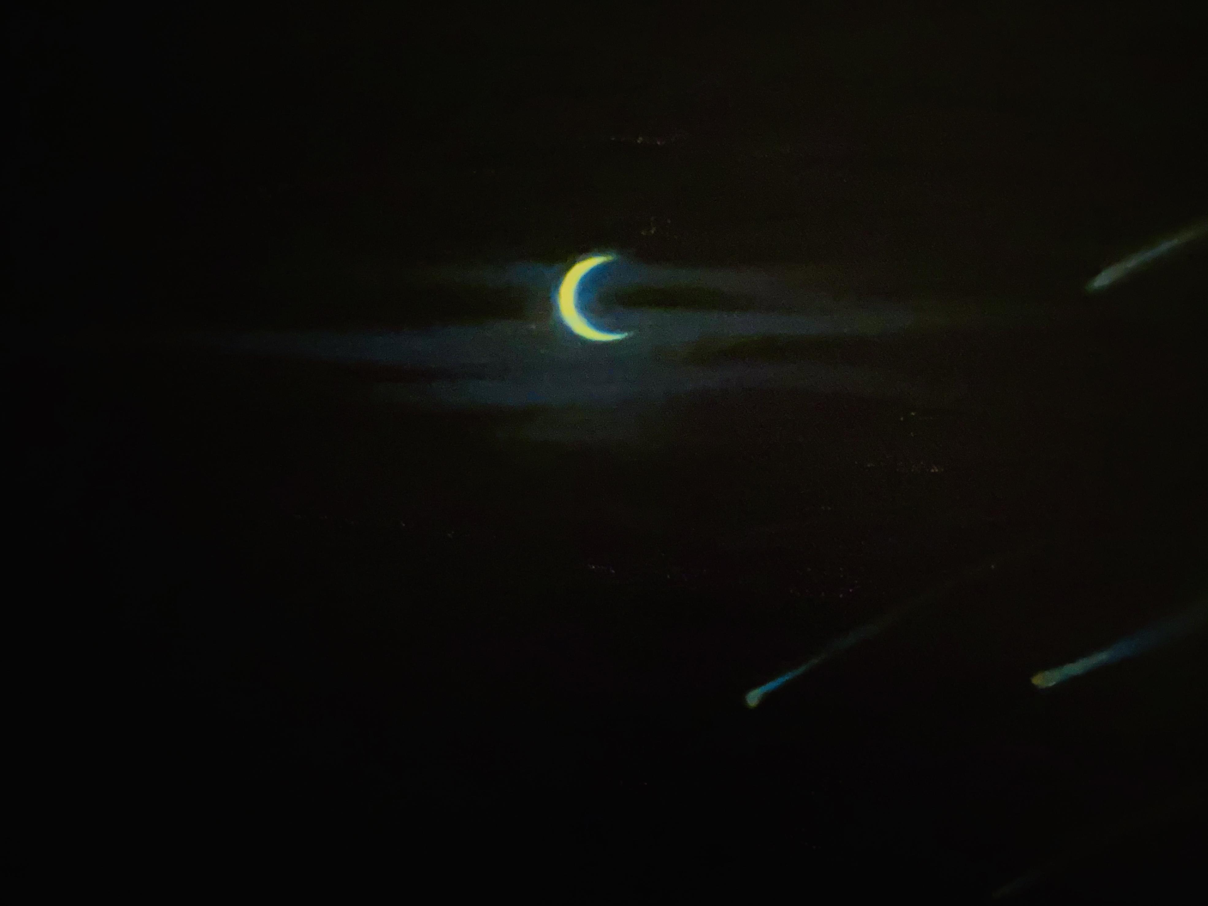 In the foreground, a small pool of water gathered from the previous day’s thunderstorm reflects the shifting colors of the morning sky. Its surface captures the ephemeral interplay of light and time, a fragile mirror of transformation. Rising nearby, steam drifts from a hotel chimney at the cliff, dissolving into the air where the moon, stars, and faint meteors still lingered. This convergence of elements—water, fire, earth, and sky—offered a moment of rare balance between transience and permanence.