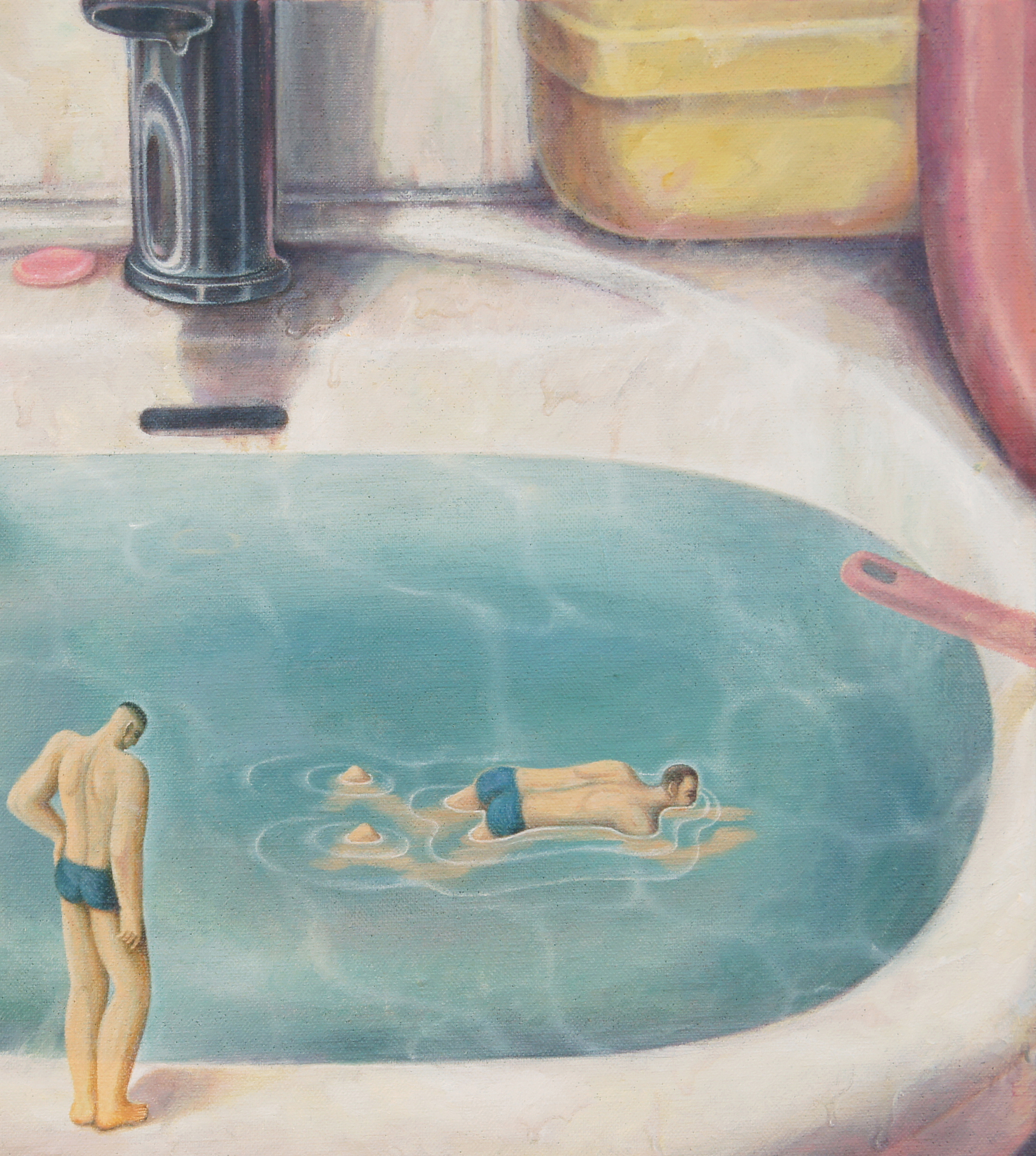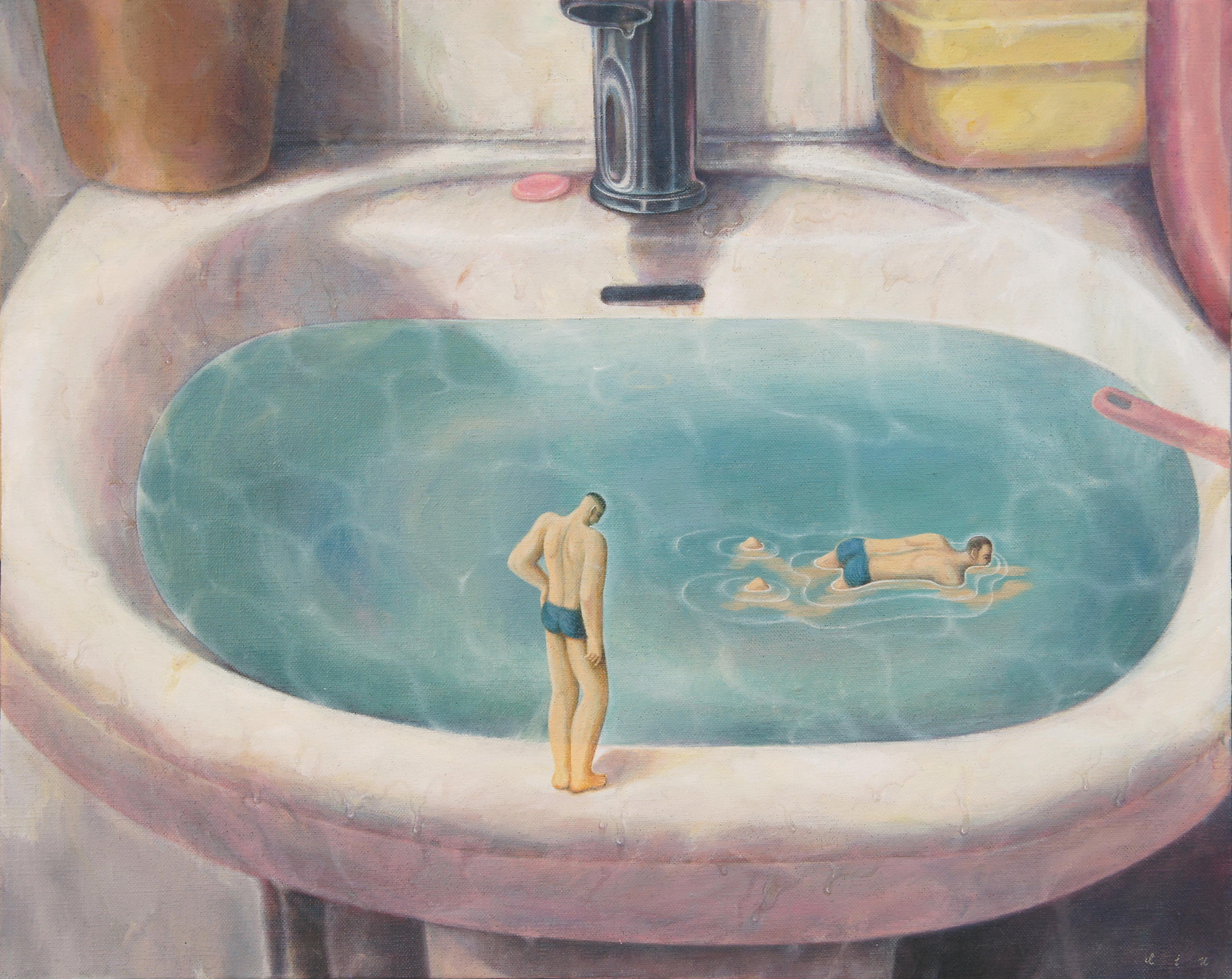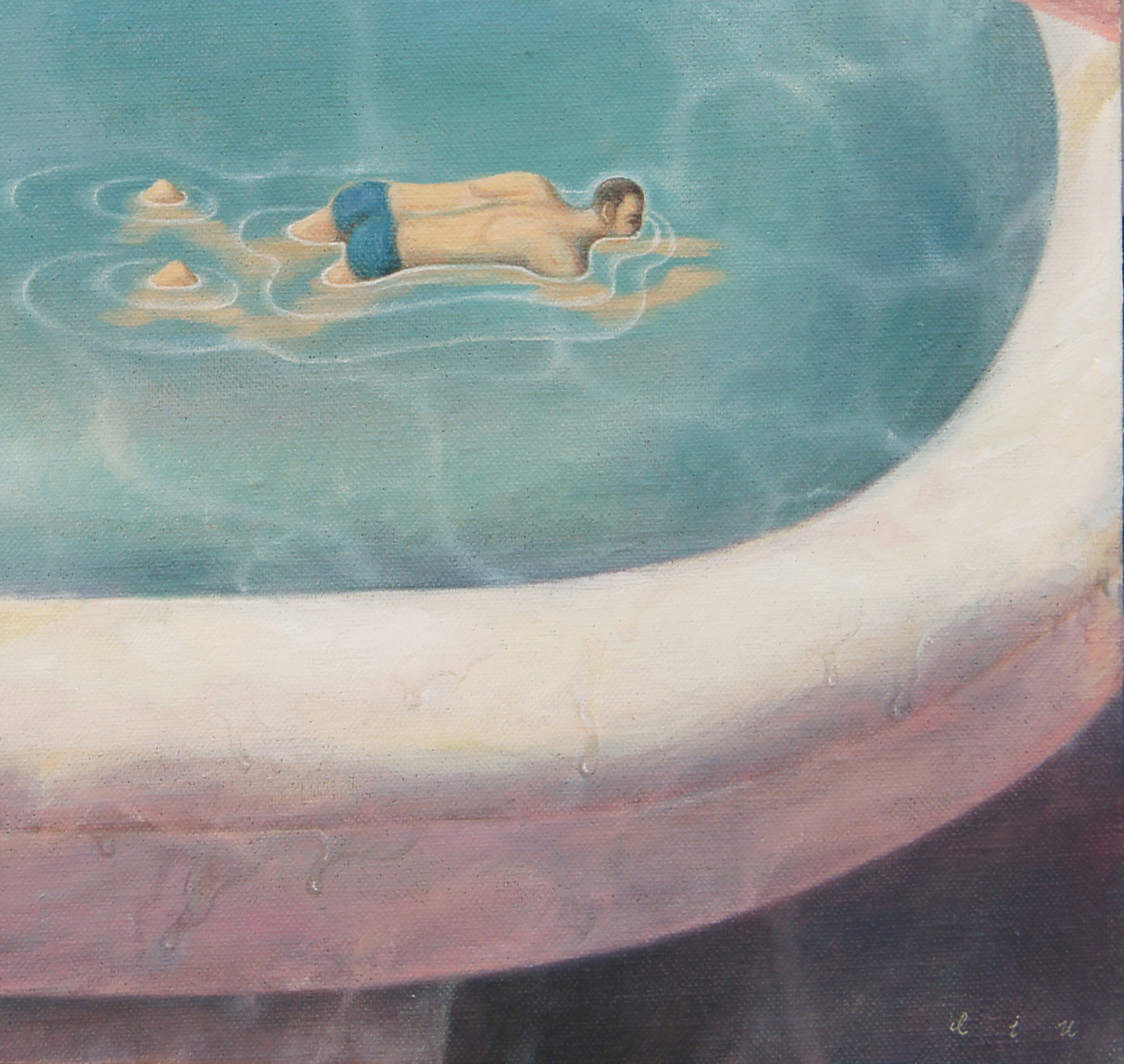 画中的朋友肌肉紧绷,仿佛真的在湛蓝的海水中划水,尽管他的“海洋”不过是一个洗脸盆。而画中的我,则踏在洗脸盆边缘,低头凝视着水面和我的朋友,眼中充满了沉思、羡慕,甚至还有一丝犹豫。我们形成了一种奇妙的平衡:一个潜入水中,一个映照着水面;一个在微观世界里活动,一个在宏观世界里观察。