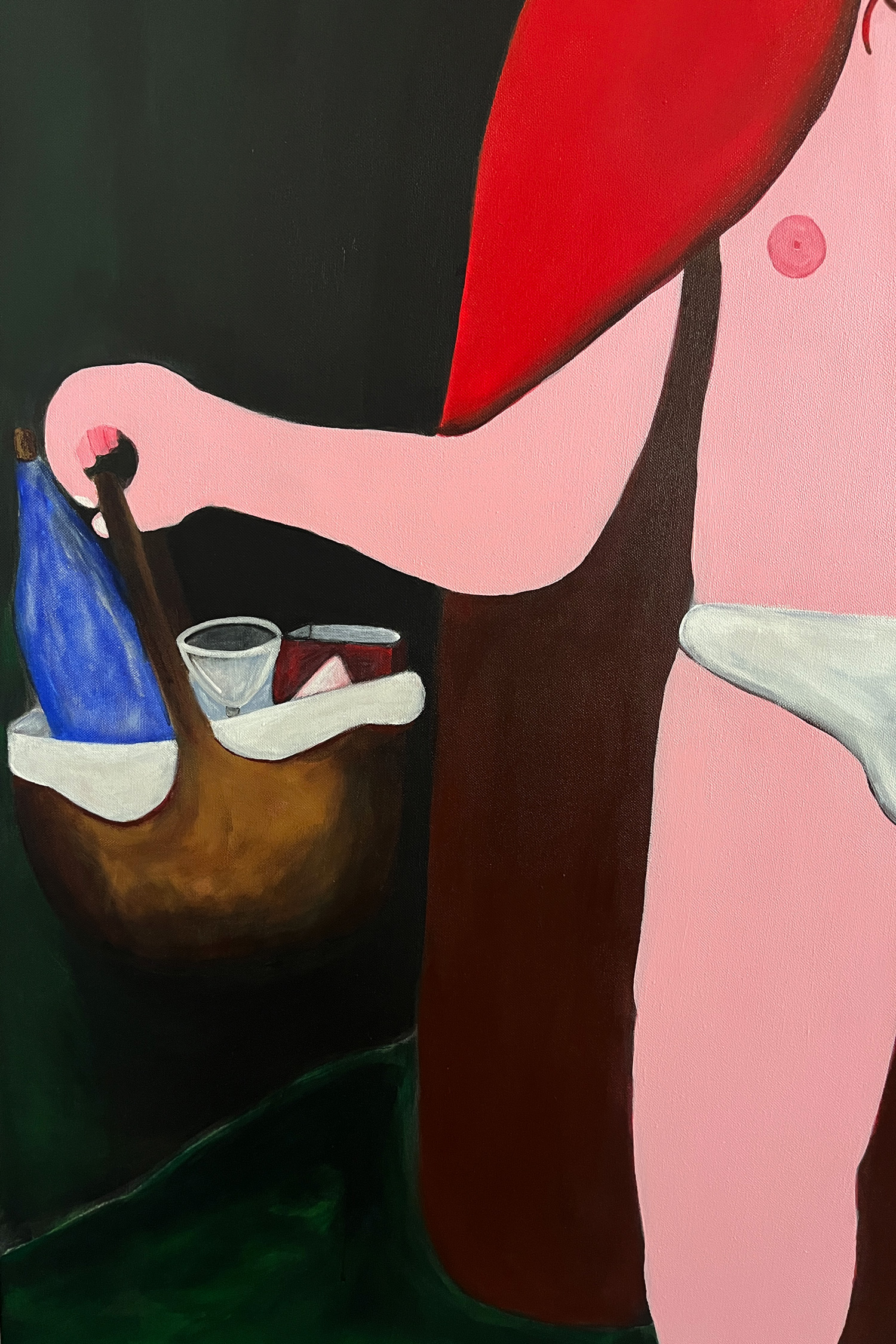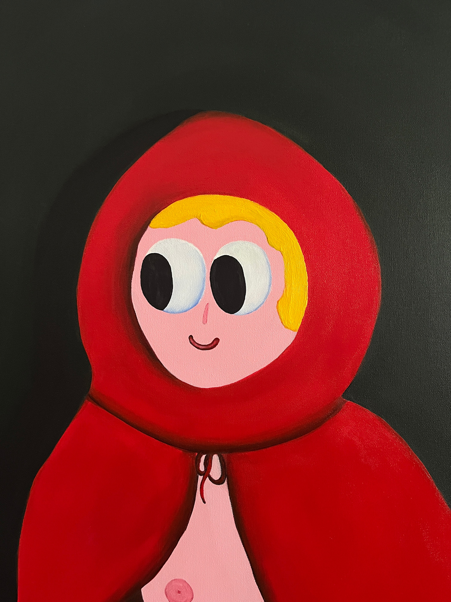 The work was created in a broader exploration of how childhood stories and archetypes continue to shape cultural imagination. By translating them into my visual vocabulary – bold colors, cartoon-like figures, and playful reduction – I aim to reveal the tension between the harmless and the unsettling. What appears humorous at first glance carries undertones of vulnerability, shame, and corporeality.
