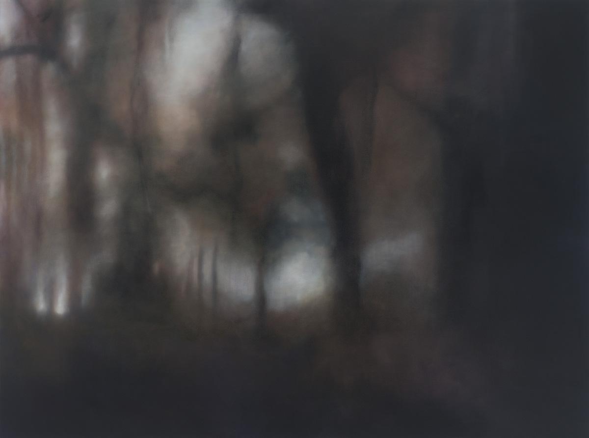 It is painted in a glaze painting technique by deconstructing the image in many colored layers and adding them again what leads to the blurry appearance that changes in different light situations.