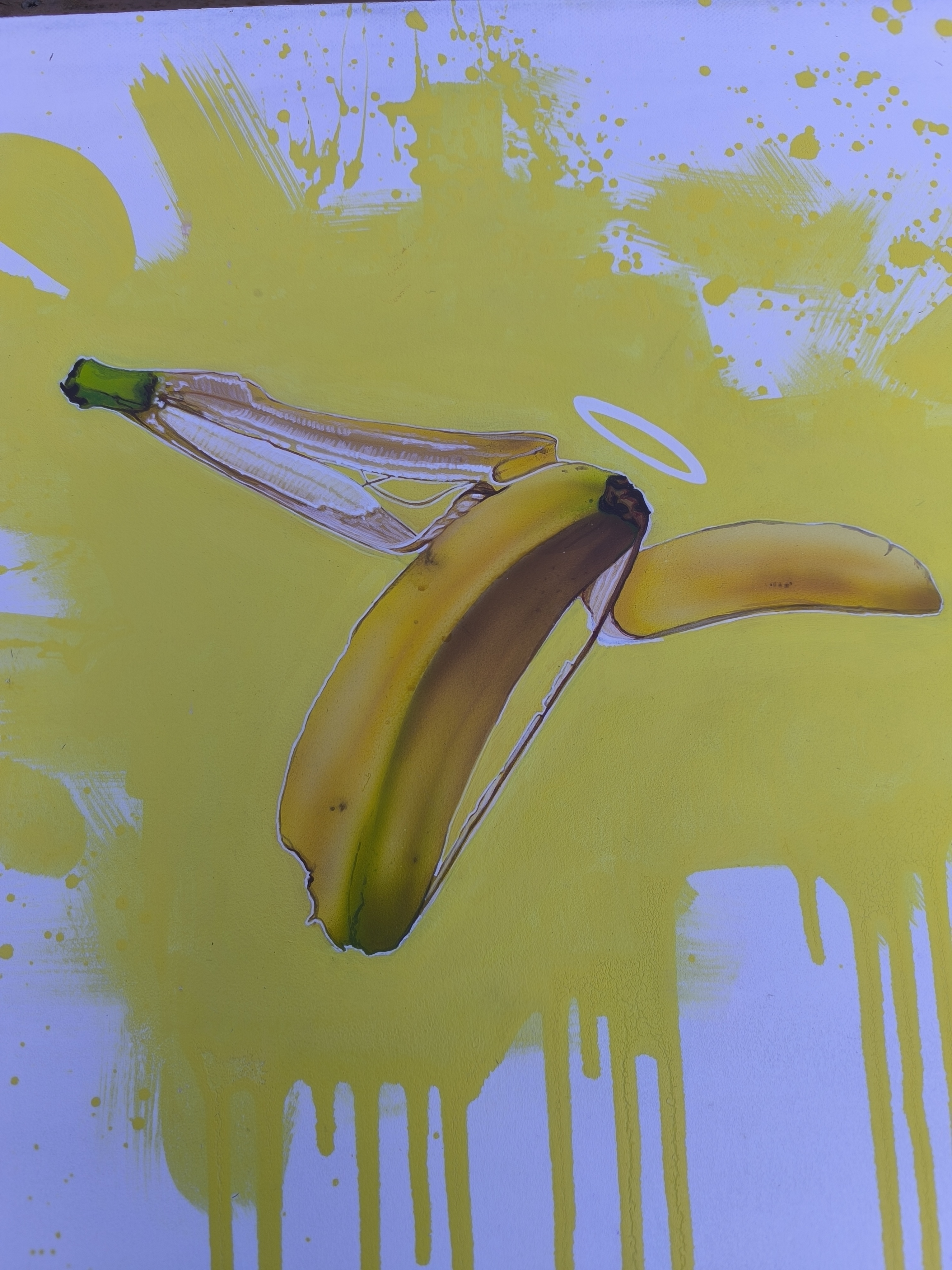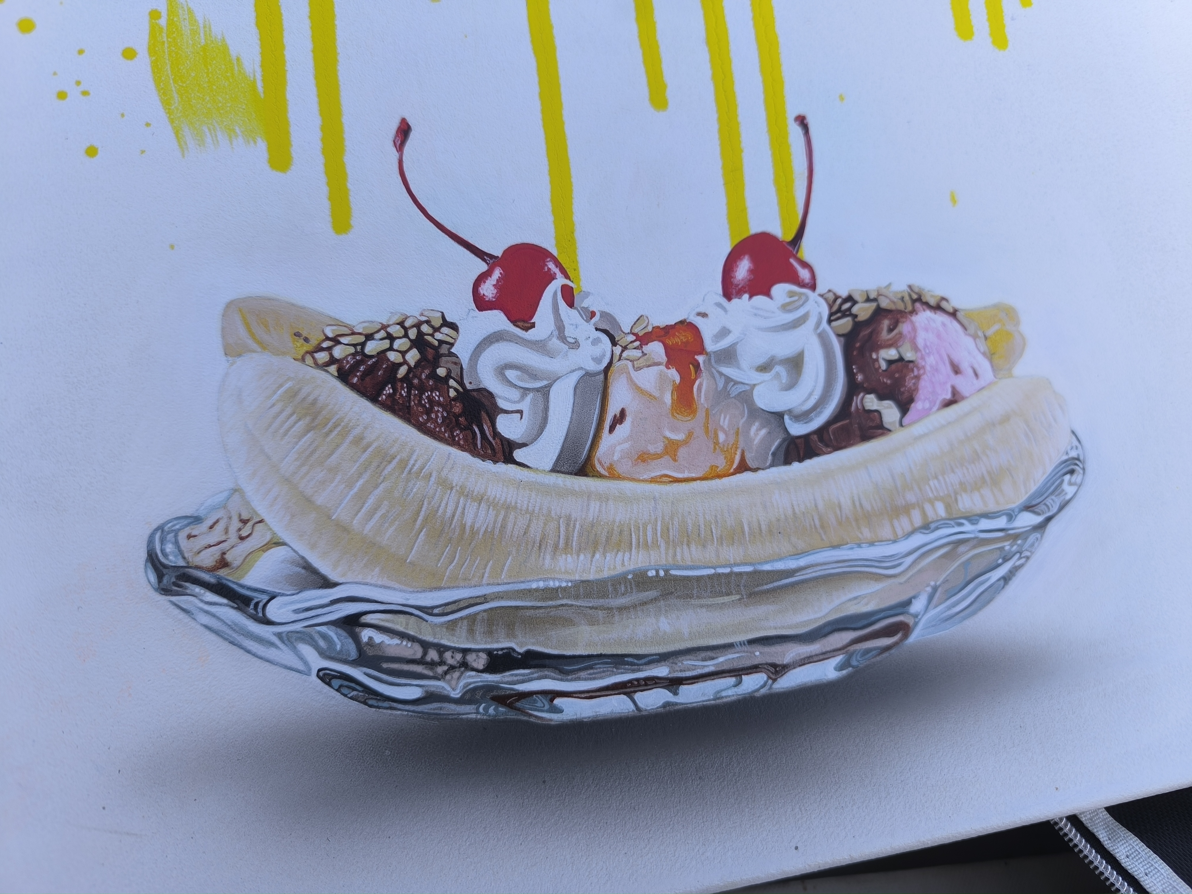“Banana Split” blends hyperrealism with playful surrealism, transforming familiar objects into a moment of levity.