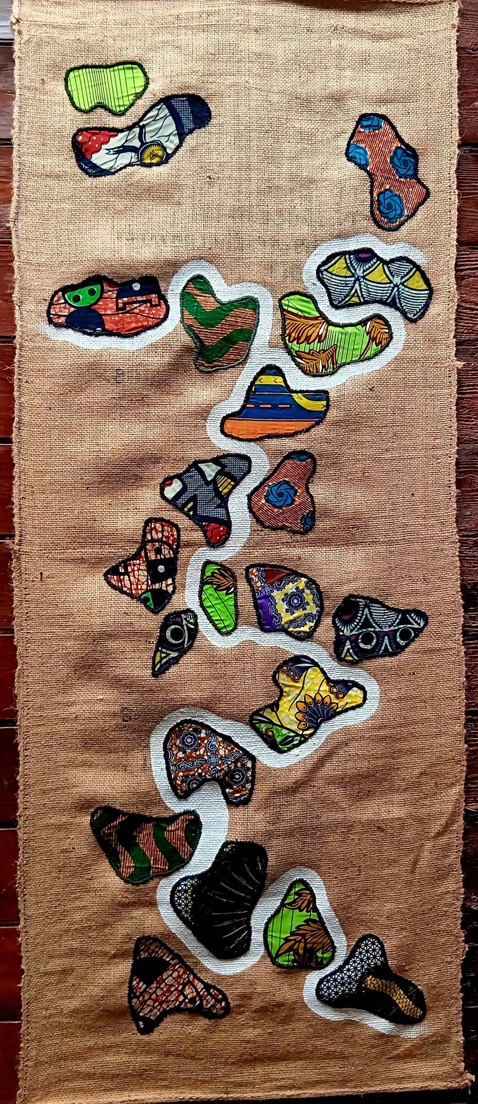 barena della laguna di Venezia - assemblaggio stoffe, filo di lana, acrilici su sacchi di juta per il caffè