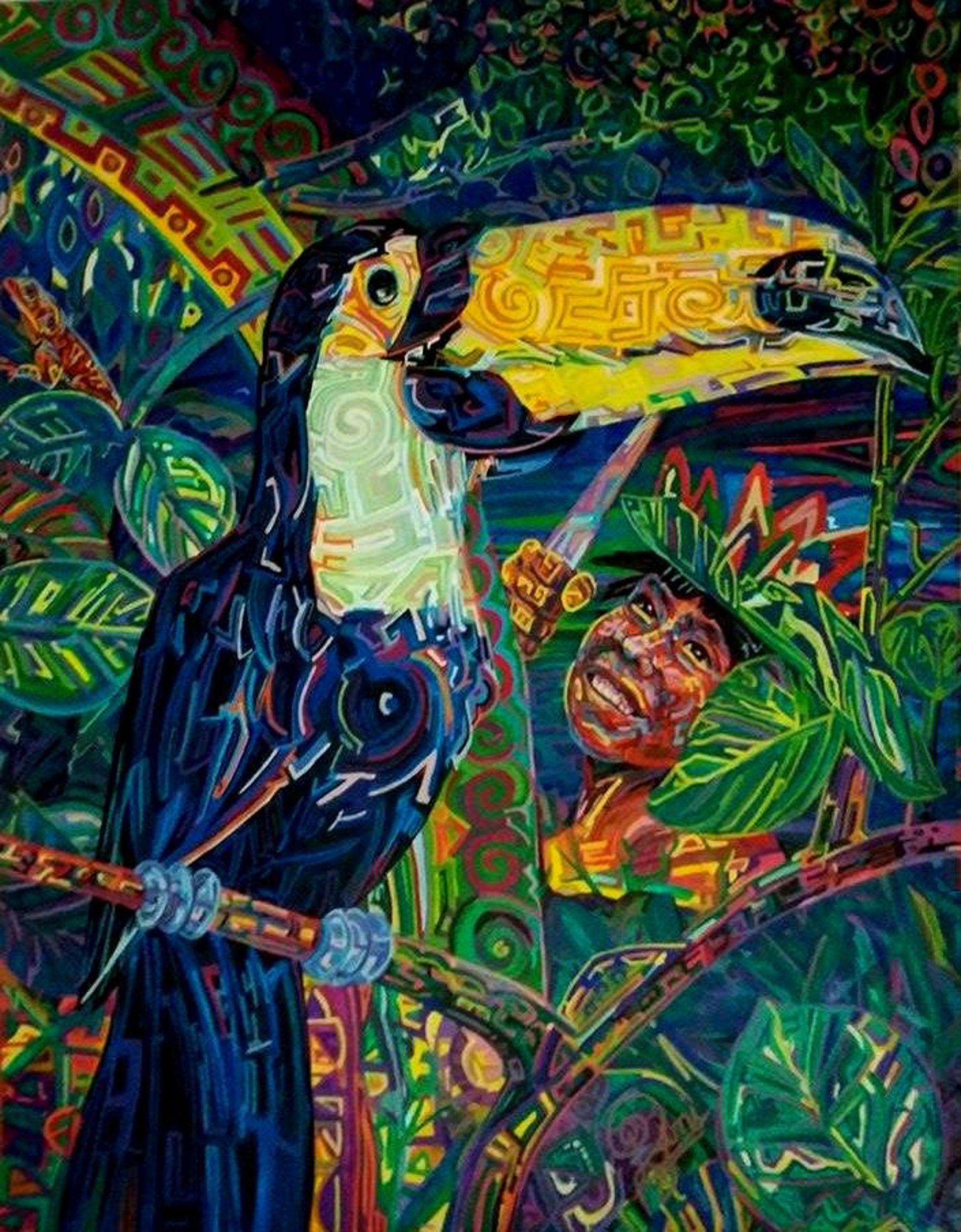 products for their own subexistence. Indigenous graphics are also present in the works of the artist Dini, no more just symbolic cultural adornments. These symbols are dressing and covering all the details of his paintings, stimulating the viewer, on a trip, to know and discover the charms and beauty of nature, each one further away from our fabulous “civilized world”.
