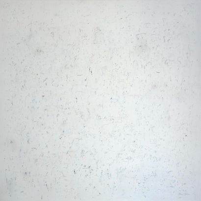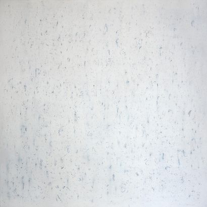 Travail minimaliste où le détail prend toute son importance. Les griffes, les points à peine visibles, les matières subtiles de blancs différents et de bleus en sous-couche. Plaisir du presque rien, même du grain de la toile, des légères épaisseurs et des trous à peine visibles qui révèlent la couche arrière plus foncée. Aussi équilibre entre les matités et les brillances. A voir de près, telle est aussi mon invitation.