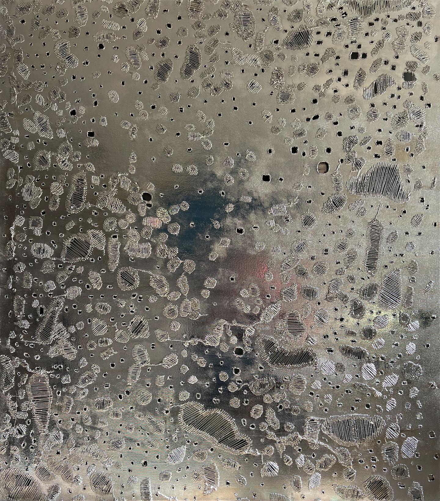 Hand stitching, copper, zinc, chrome and silver on canvas