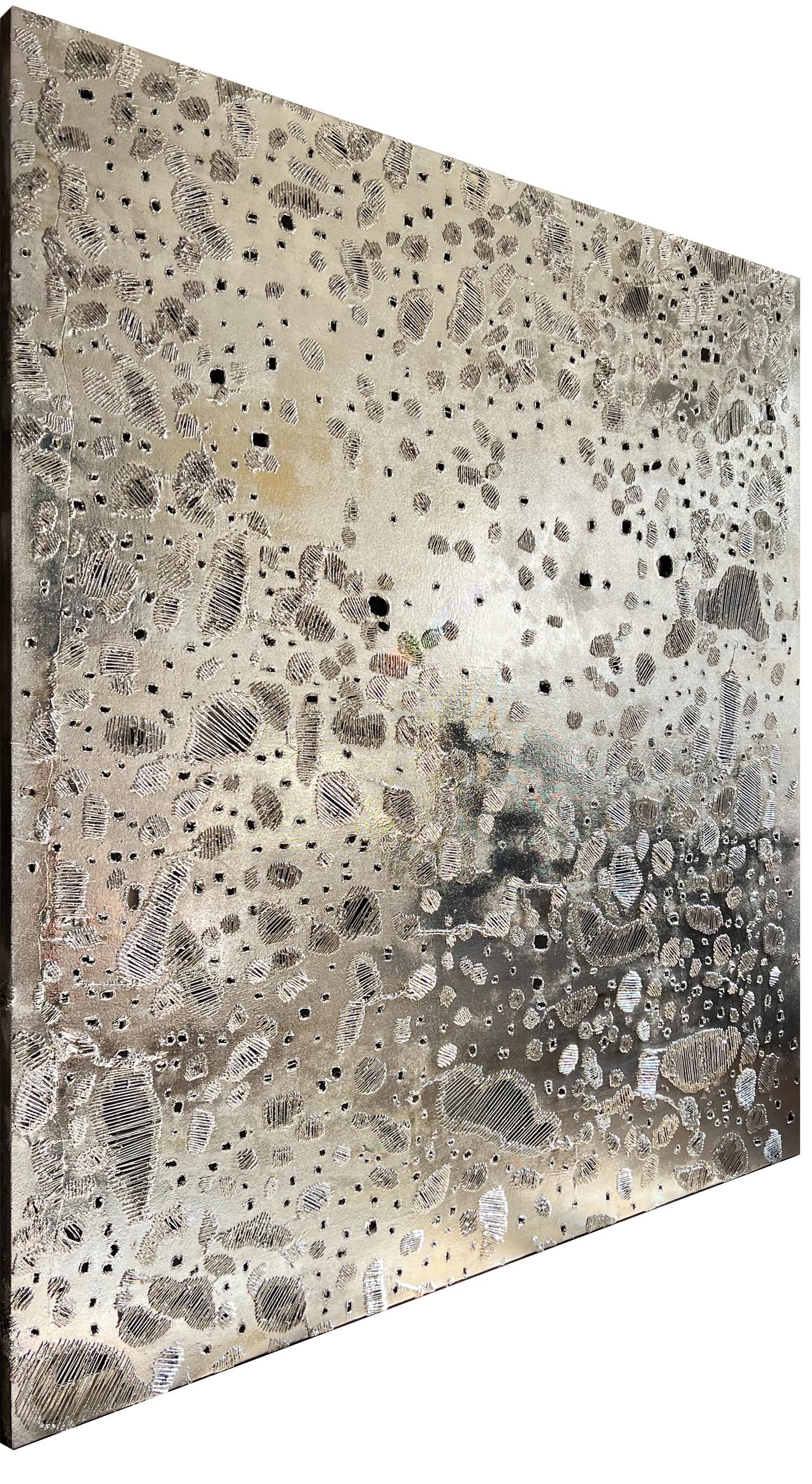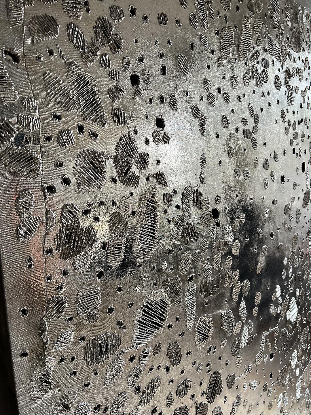 This work is a dialogue between memory, material, and resilience. Through hand stitching as fiber art, plaster, and metallic surfaces,... Read More