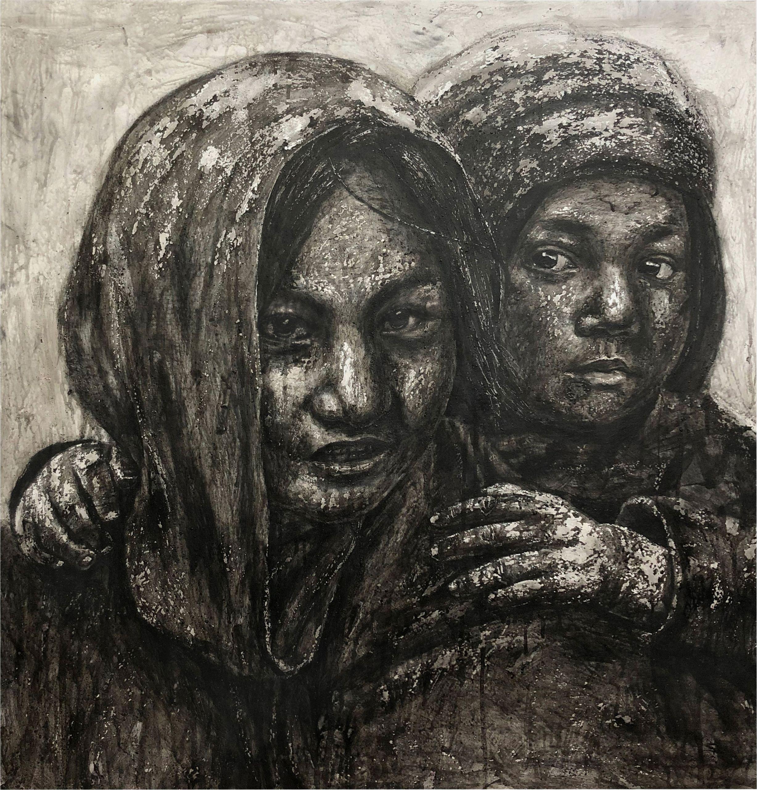 Black and white images made of latex / propylene / carbon / propylene represent the simple humanistic world of mother and daughter images.