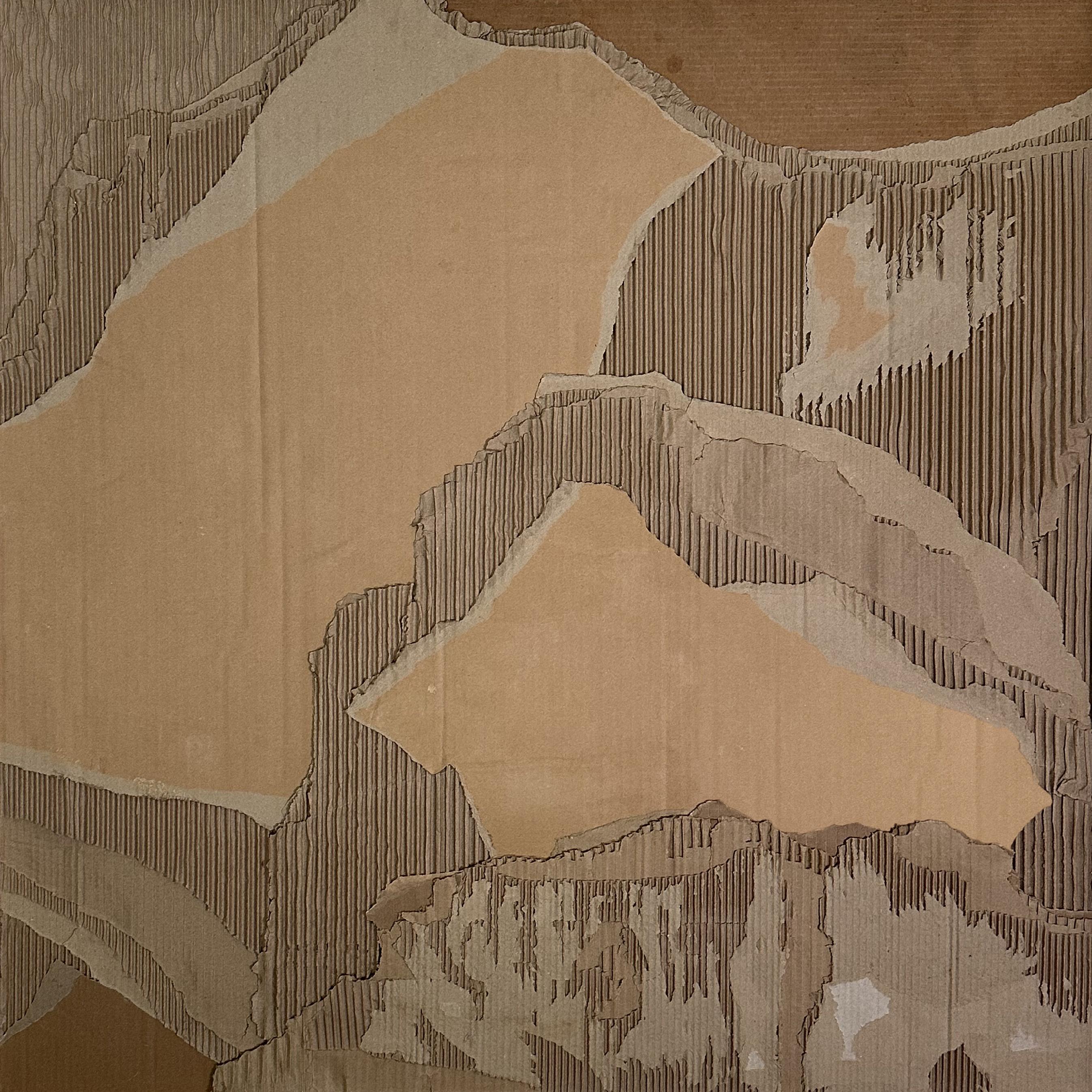 The process begins with the recovery of packaging boxes: anonymous cardboard destined for recycling. The panels are torn decisively, revealing the internal “soul” of the material — overlapping layers, differing in texture and tone.