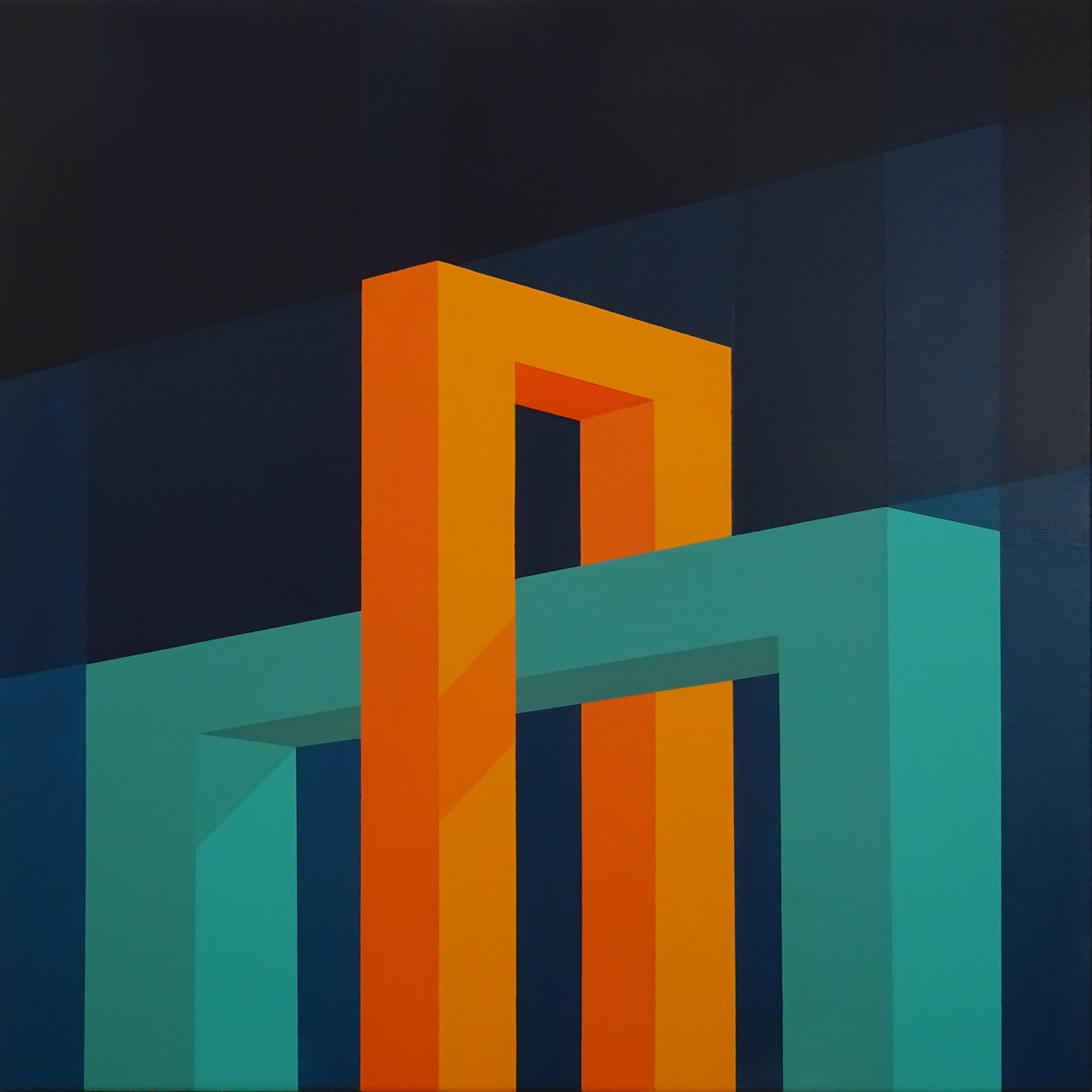 Coexistence is a striking composition that explores harmony through geometric abstraction and bold color contrasts. The interlocking architectural forms, painted in vivid shades of orange, cyan, and deep blue, evoke a sense of structural dialogue—where elements of different origins and temperaments find balance in shared space. The interplay of light and shadow emphasizes both the independence and interconnectedness of each form, suggesting a metaphor for coexistence in social, emotional, or architectural contexts. This piece invites viewers to contemplate the balance between individuality and unity, strength and softness, silence and energy.