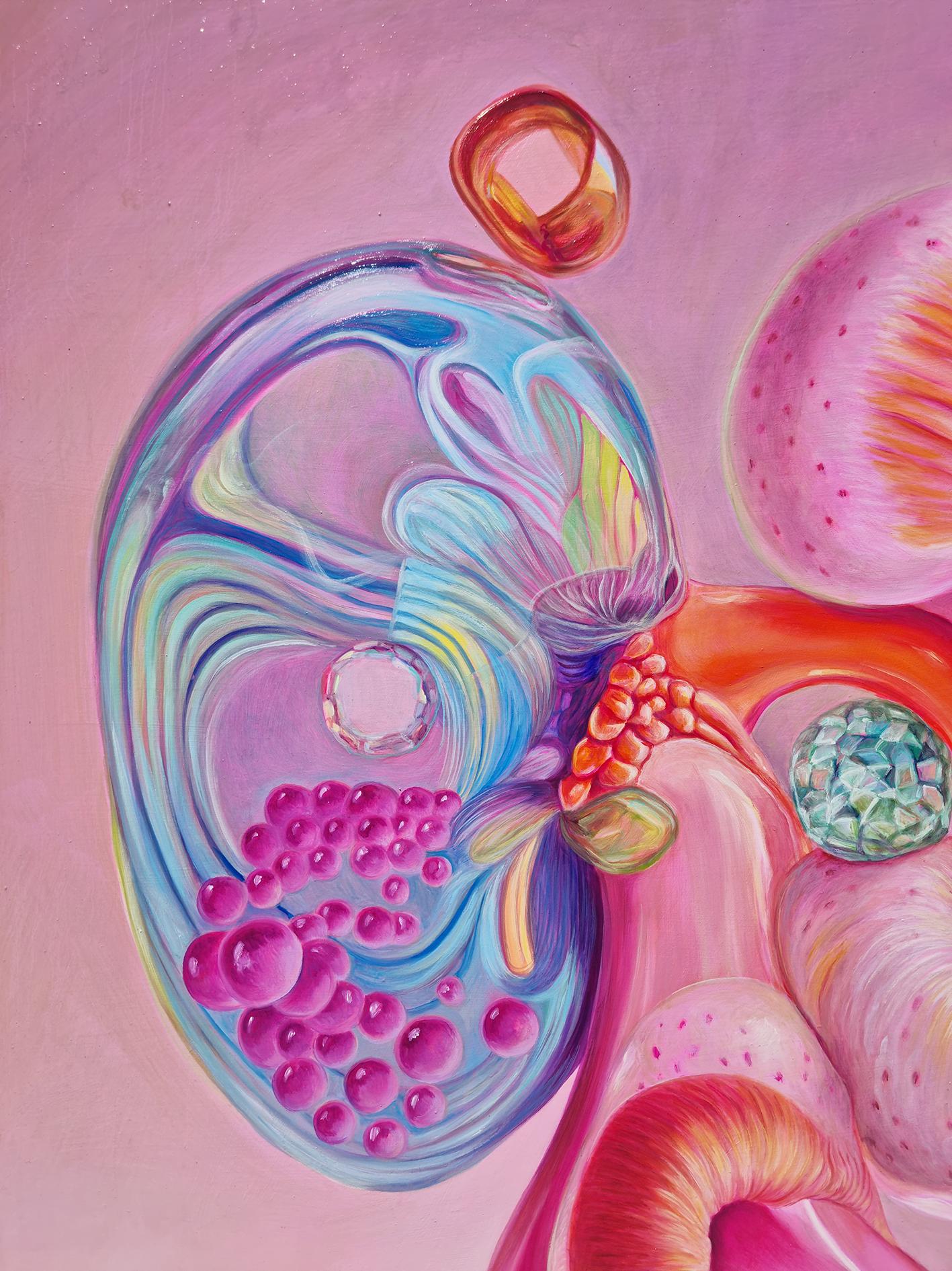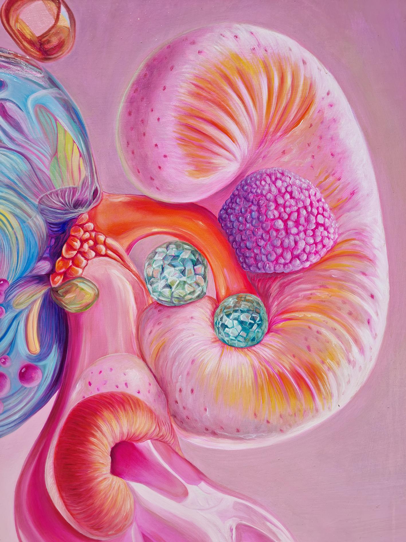 Two kidneys, two natures: one of flesh, warm and sensitive, ready to adapt; the other of glass, fragile and rigid, built to defend. Together, they filter what scares, separate the essential from the toxic, and process danger like a vigilant psyche. Supporting them, an instinctive, archaic creature that embodies the threshold between impulse and survival.