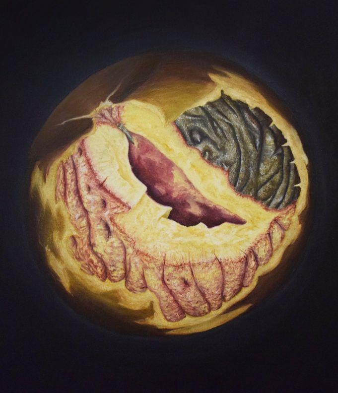 The idea is the same as in the counter-figurative art #9 - to show the optimal view of the structure of the object in the volume, interpreted in a variation of the world, which is multidimensional and contains smaller dimensions. Here all the sunken parts allegedly became protruding, protruding hollow, but there is one point: the picture shows only the skin of an fruit, its flesh and bone, but without its interior, while the bone itself is cubic counter-form and reflected from the sphere.