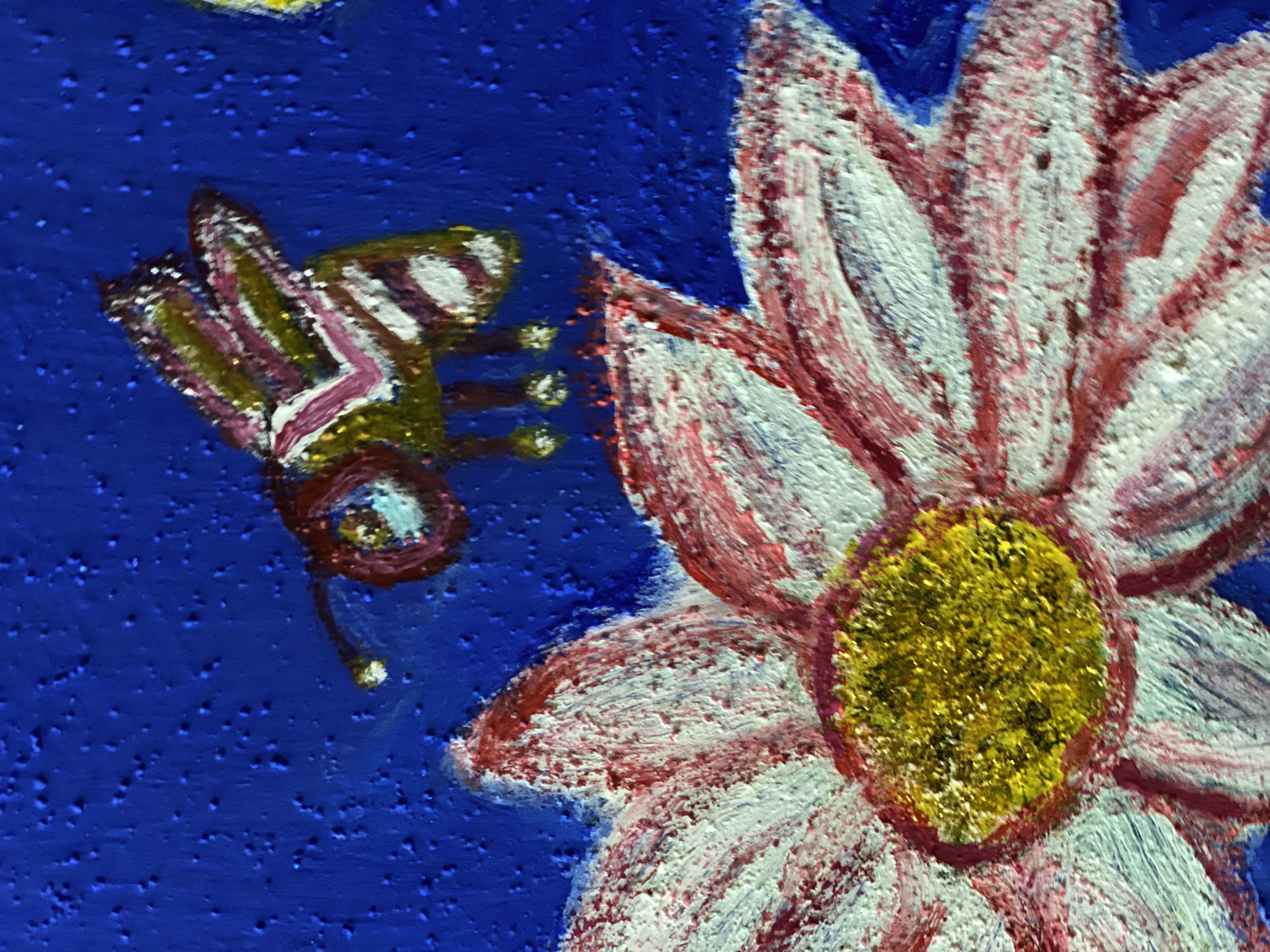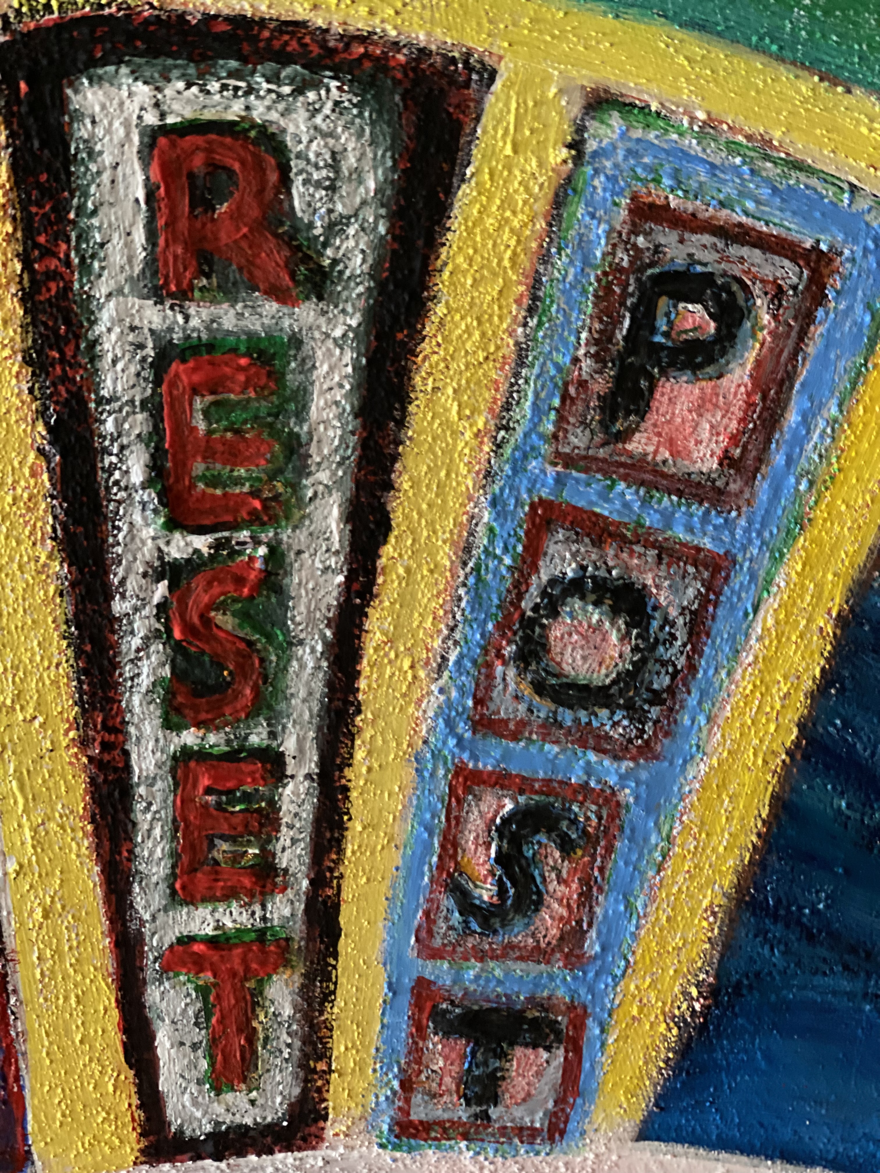 the face symbolizes violence, while the moustache recalls both Chaplin and