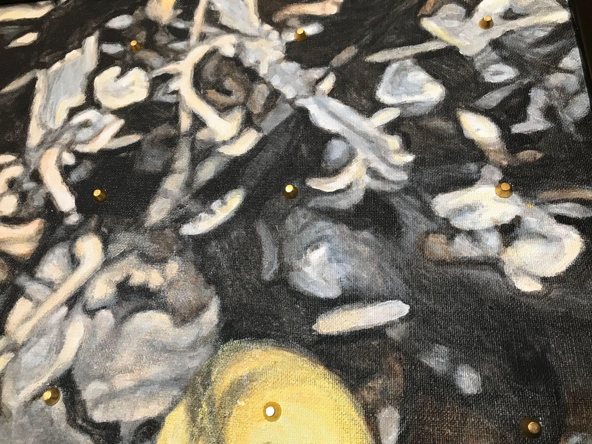 The painting is a quadriptych with dimensions of 120 x 120 cm,