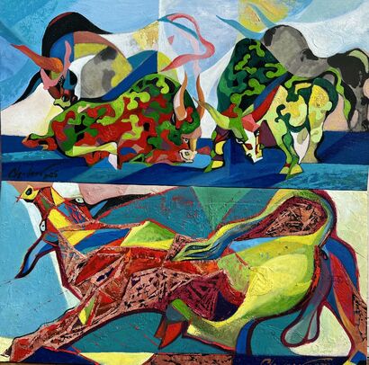 In Fire Flame, Chadraabal Adiyabazar translates the eternal energy of Mongolia’s spirit into a dynamic symphony of reds, golds, and fiery tones. The composition centers on the Soyombo—a symbol of independence and cosmic harmony—radiating strength and unity. Around it, galloping horses emerge from the flames, embodying vitality, freedom, and the pulse of the nomadic soul.