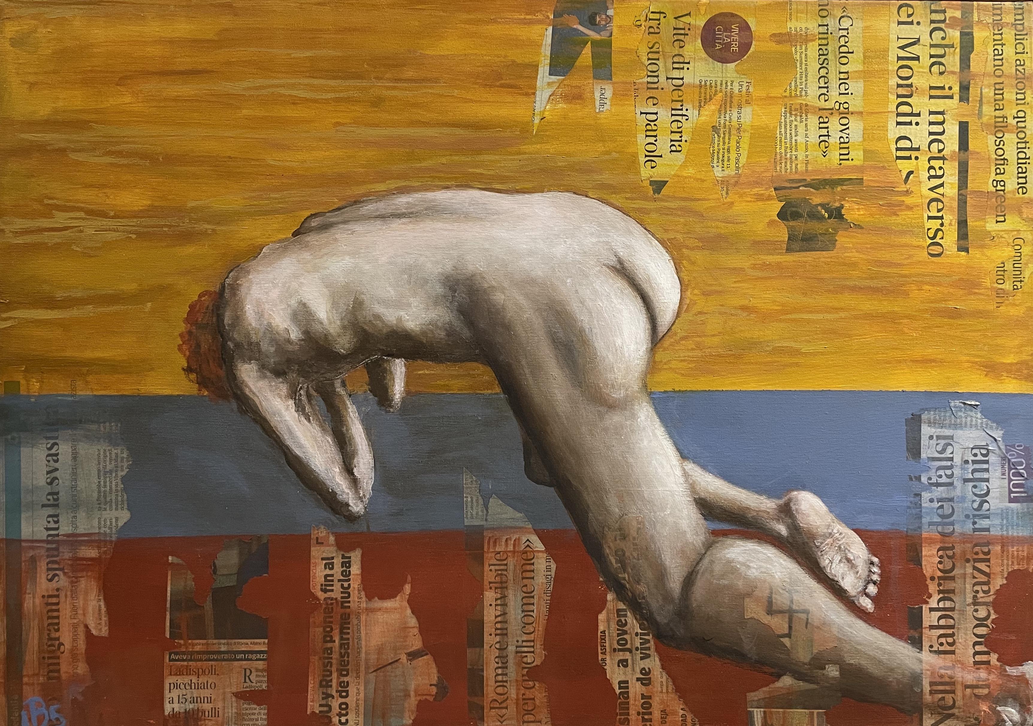 Gabriel lying down, tells the story of many young people tired by a lot of toxic situations for them and the little hope offered by contemporary society (clippings of Italian and foreign news articles).