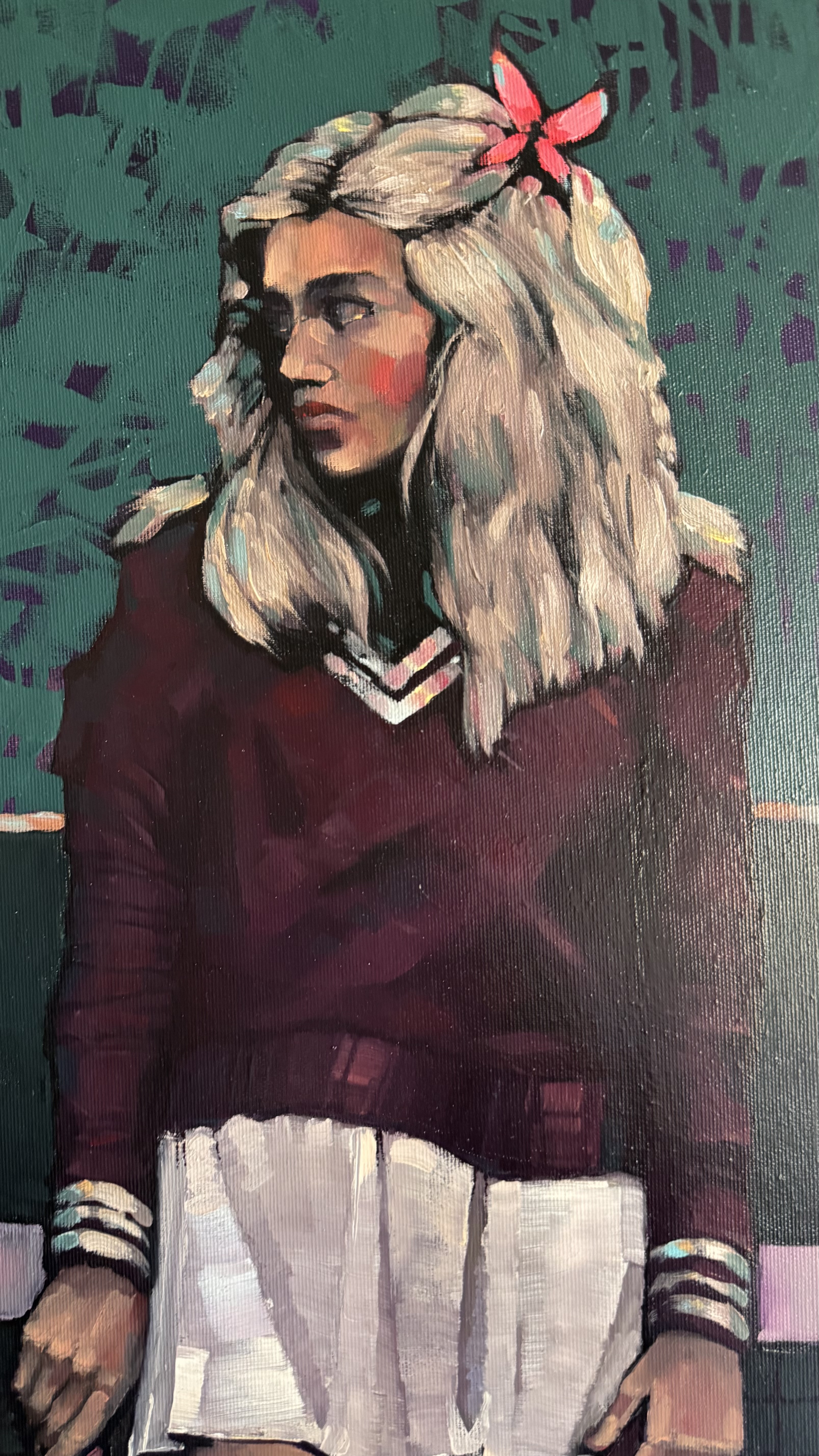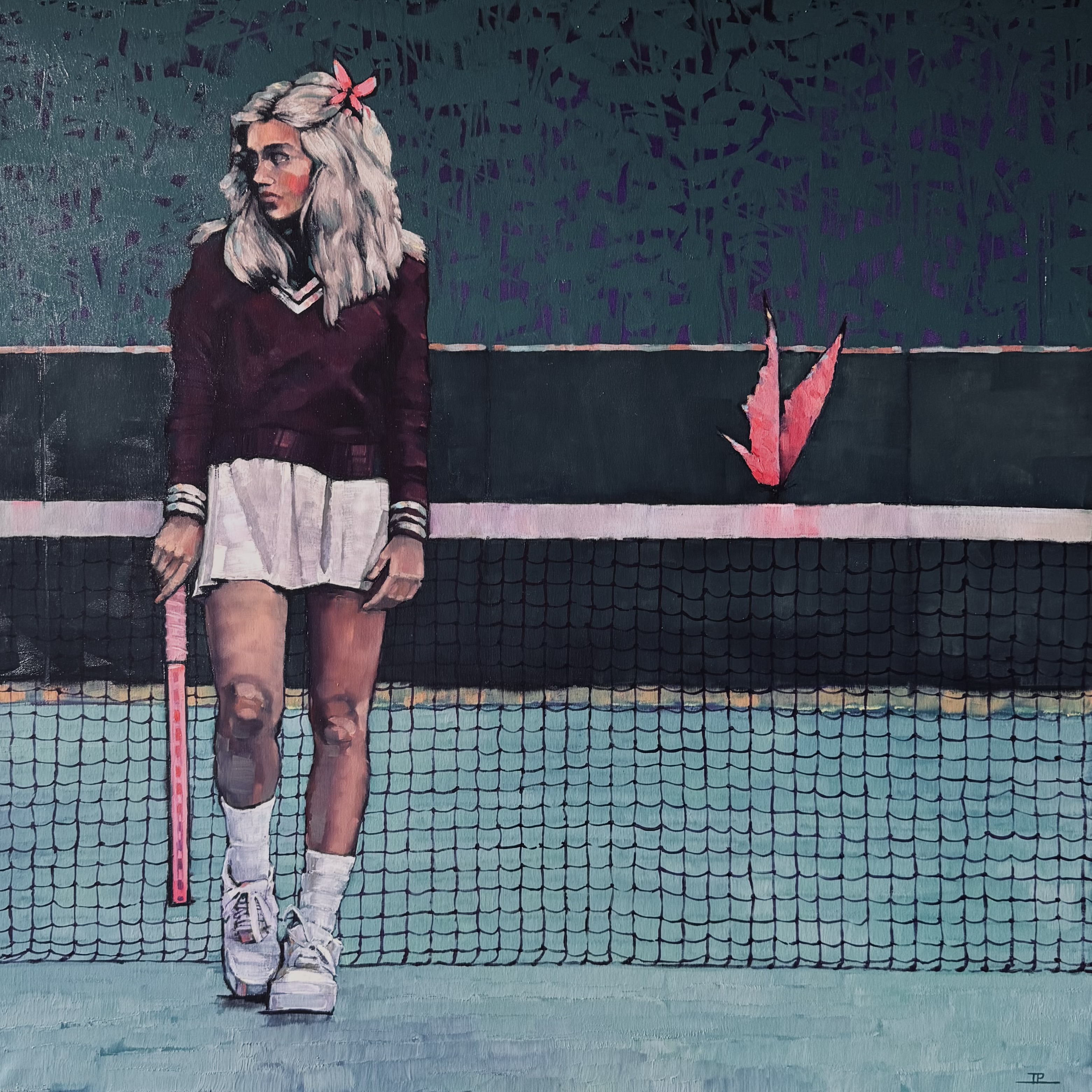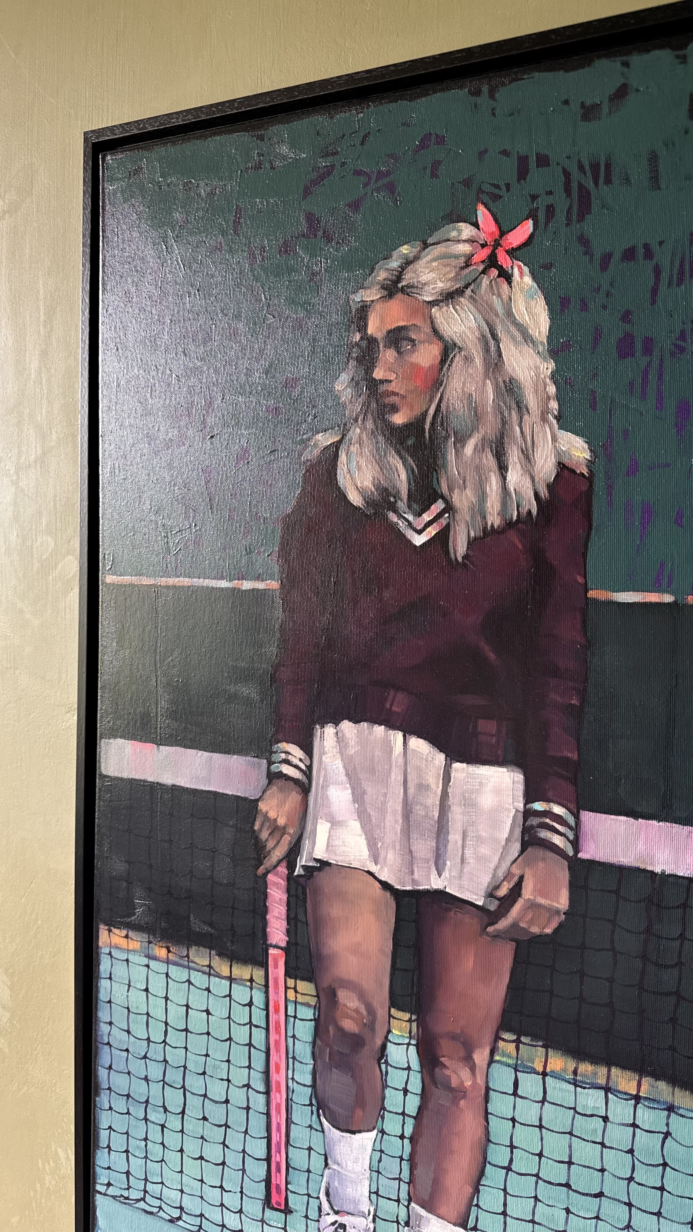 Intriguing moment with girl and butterfly on a tenis pitch. Sensual, magic, calm, sophisticated and natural in one moment.
