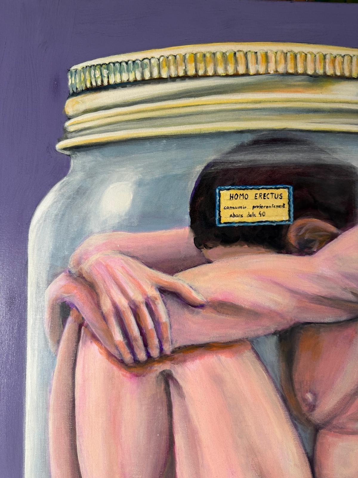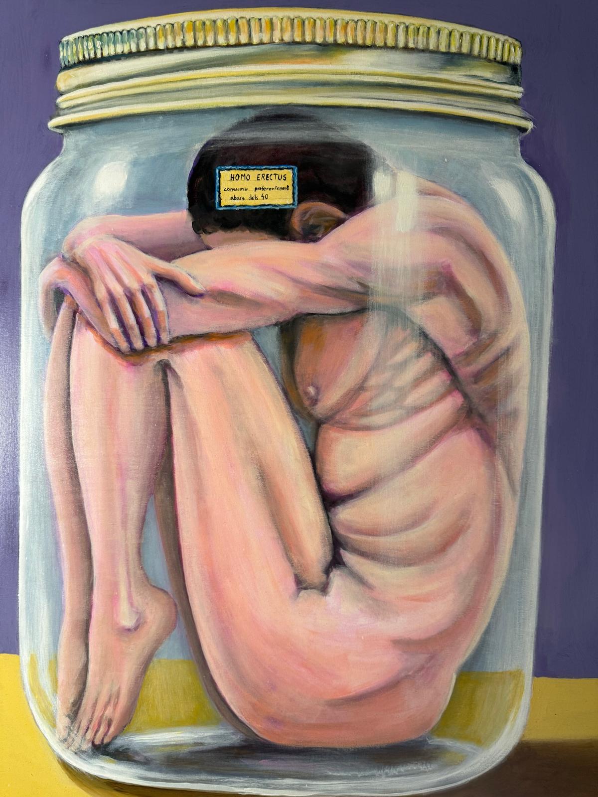 Refleja la presión social que margina y descarta a las personas al llegar a cierta edad, especialmente a partir de los 40. La figura humana encerrada en un frasco, etiquetada, como si fuera un producto caducado denuncia el Daddies ismo y la cosificación del cuerpo. Esta obra es un grito contra la idea de que dejamos de ser valiosos cuando ya no encajamos en los estándares de juventud o productividad. Aquí el cuerpo aún respira, pero la sociedad ya lo ha archivado.