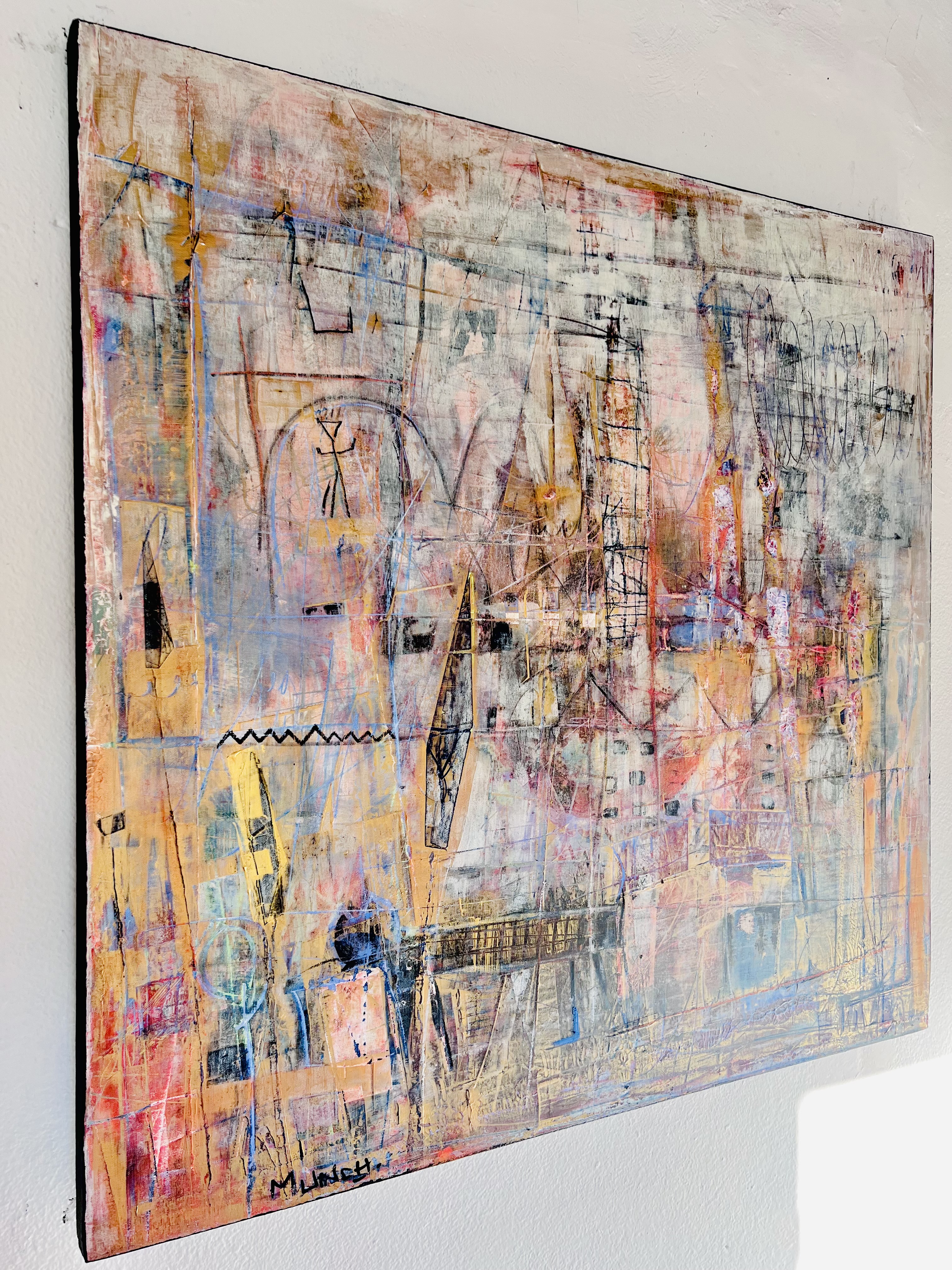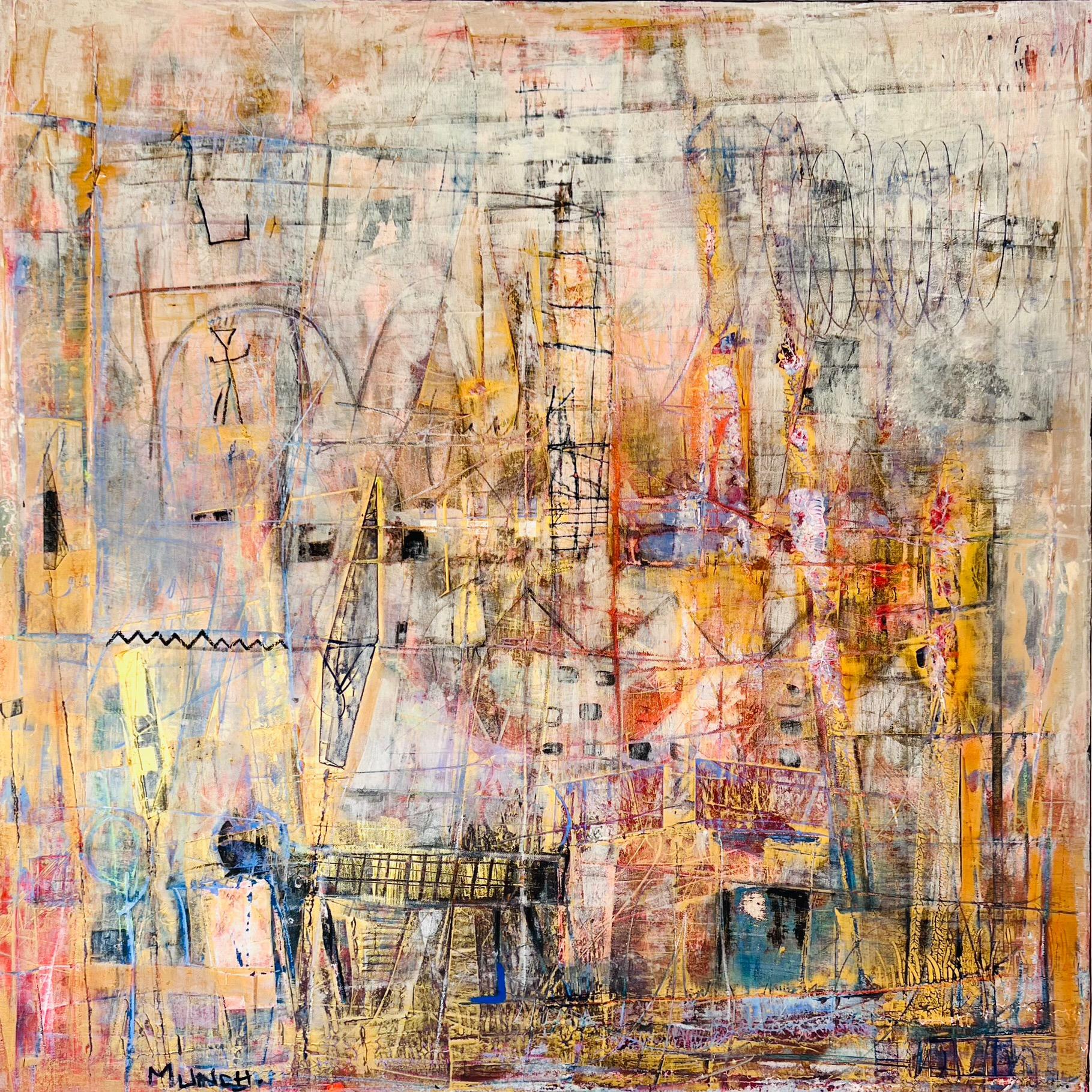 A dreamlike city seems to emerge from a veil of mist and light. Vibrant lines, traces, and transparencies intersect like memories etched in the air. The composition oscillates between construction and erasure, between dream architecture and intimate cartography.
