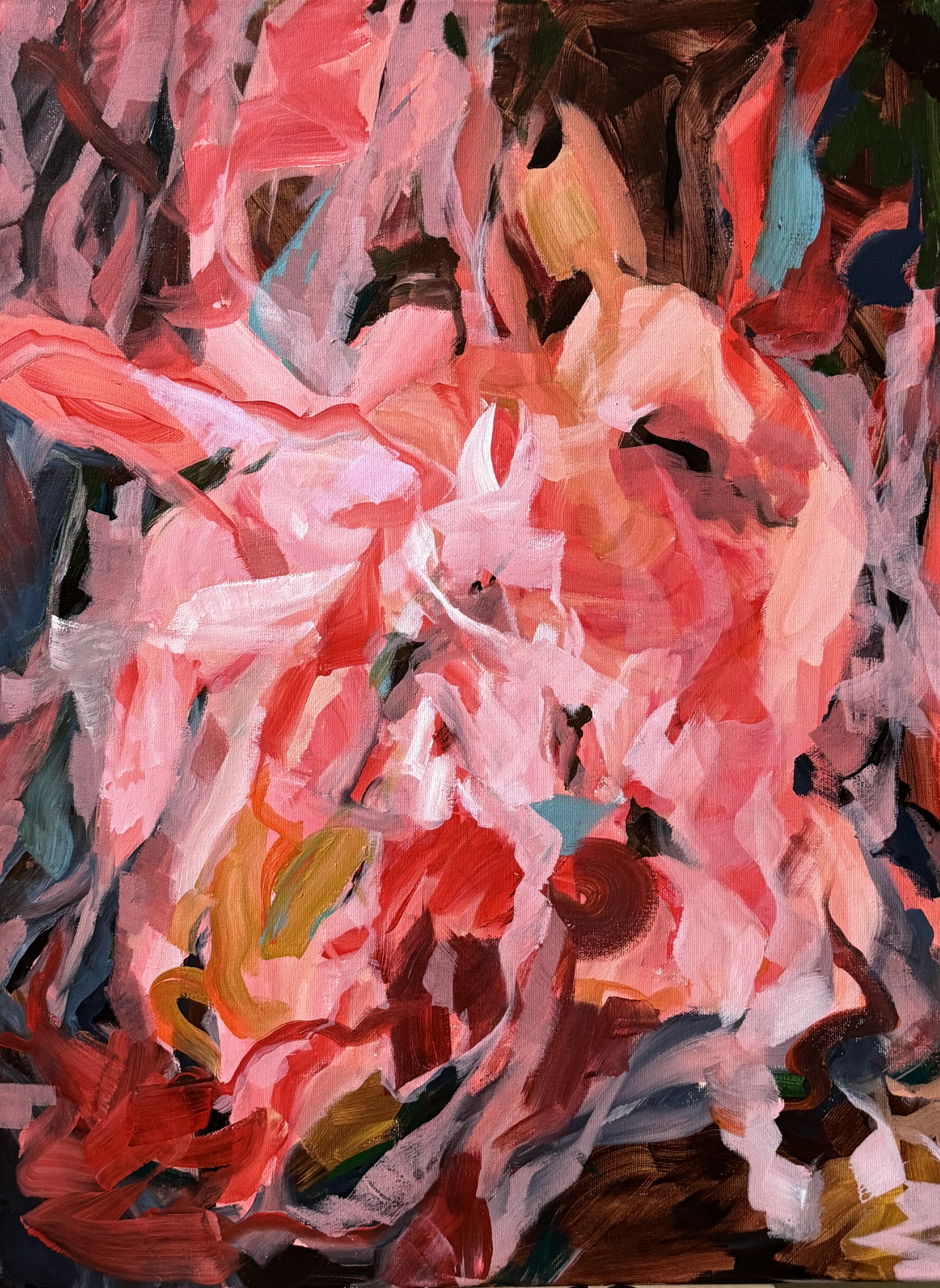 Interlace is both culmination and departure. Lines cross, knot, and disappear - suggesting connection as something not woven neatly, but struggled for. The composition is dense without being heavy, allowing space to appear within complexity. There is no single center, but multiple threads of tension and release that move across the canvas like conversations overhead This painting operates less like a conclusion than a network - a web of emotional, visual, and bodily traces that bind the series together, even as it gestures outward.