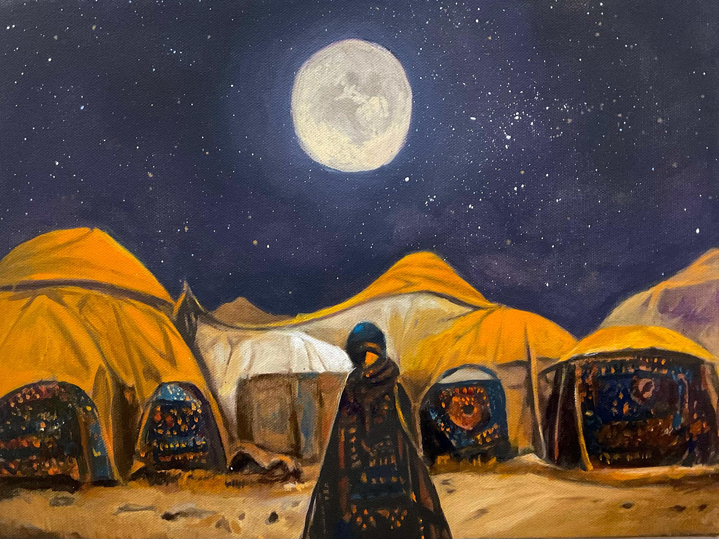 Under the fullness of the moon, a cloaked figure stands before a circle of tents, their golden canopies glowing against the night. The patterned textiles at each entrance recall Persian weaving traditions, where geometry and color carry both beauty and meaning. The title, Khaneh, means “home” in Persian, a word that holds both comfort and ache. Here, the tents suggest sanctuary and community, yet under the immensity of the stars they also stir longing and exile. The painting invites viewers into a space where home becomes both presence and memory, rooted and wandering, intimate and infinite.