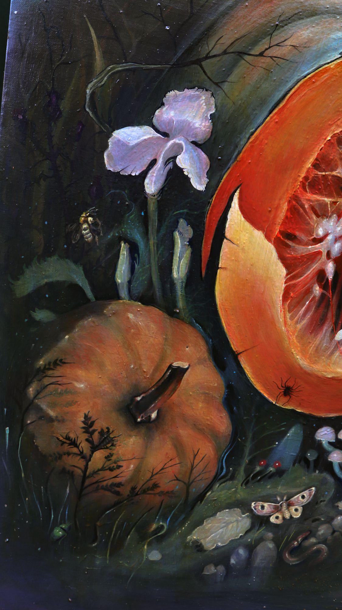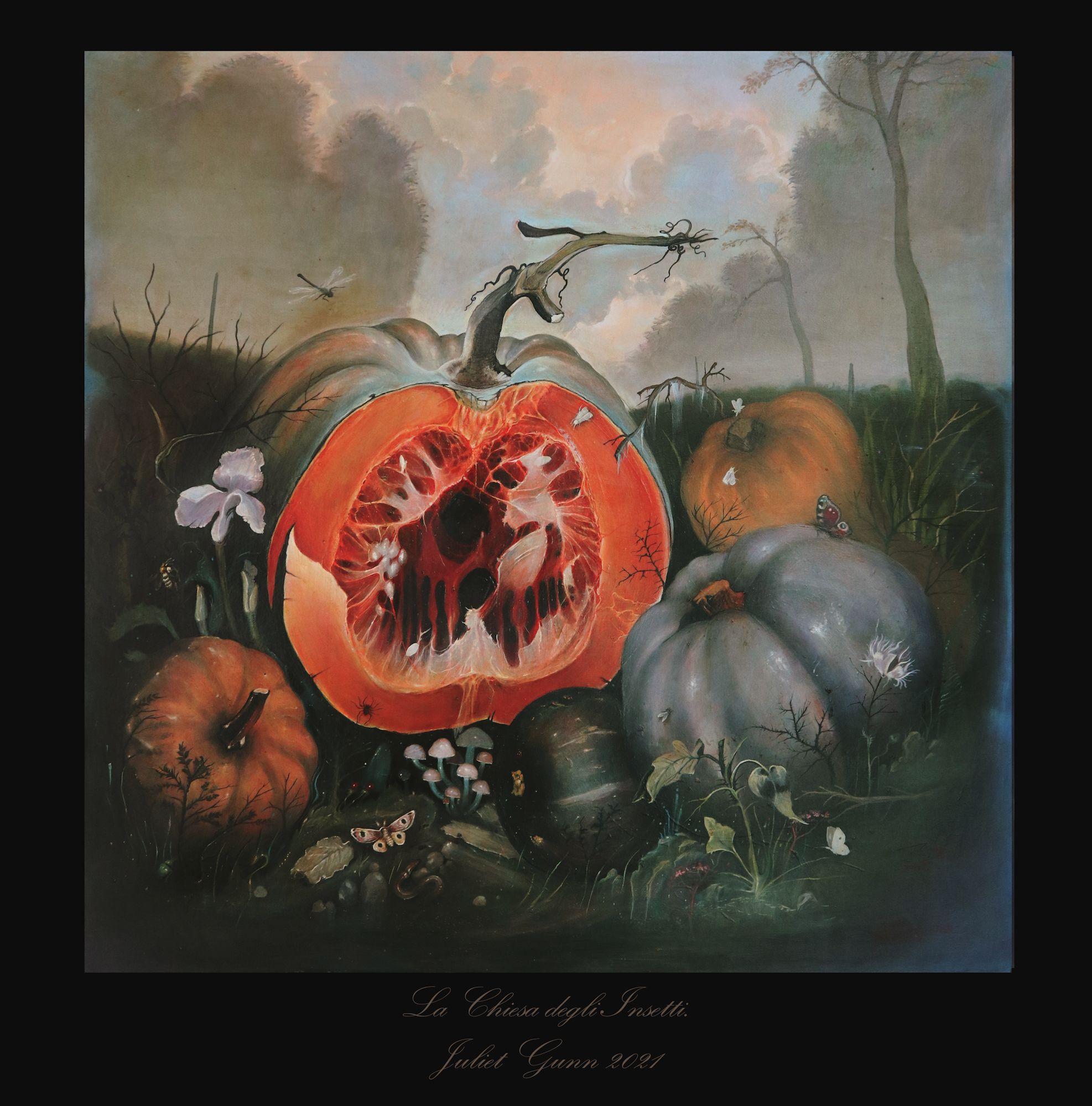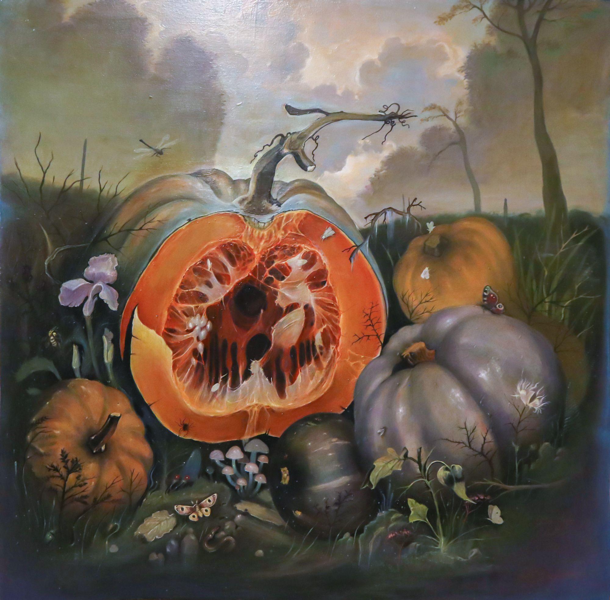 L'artista cerca riparo, un sublime conforto situato in una grossa zucca che inizia a marcire.