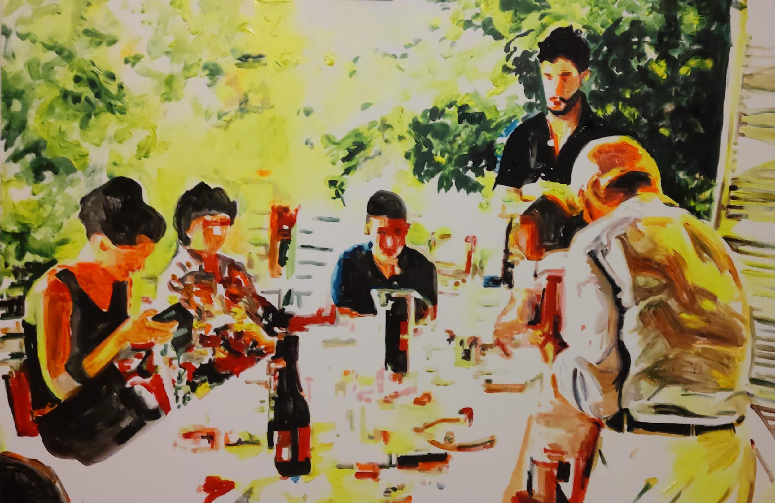 Il quadro “La nipote” raffigura una scena conviviale attorno a un tavolo, immersa in un’atmosfera luminosa e familiare. I tratti pittorici, rapidi e sfumati, non puntano alla definizione realistica dei volti, ma a cogliere la dimensione emotiva e relazionale del momento.
