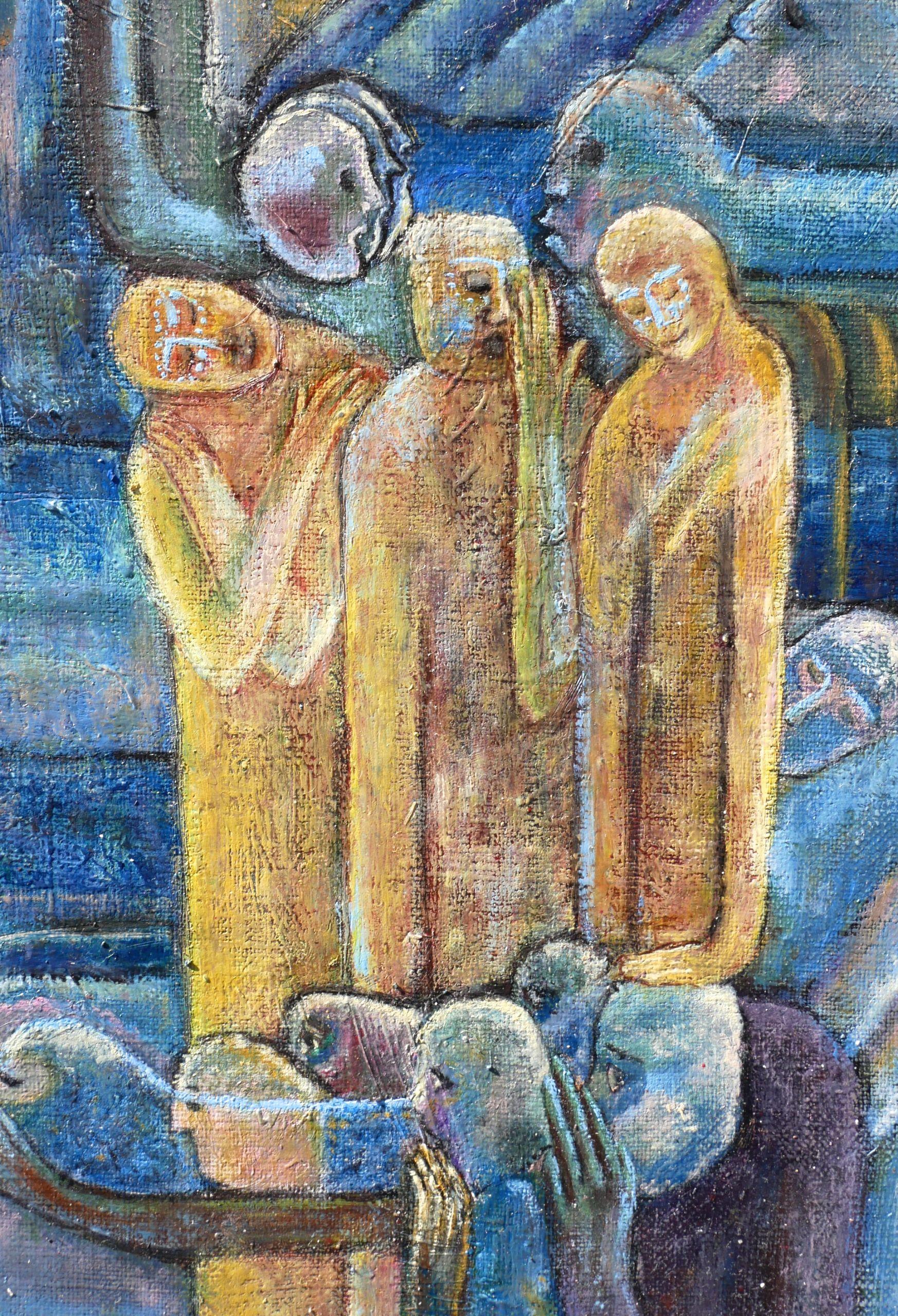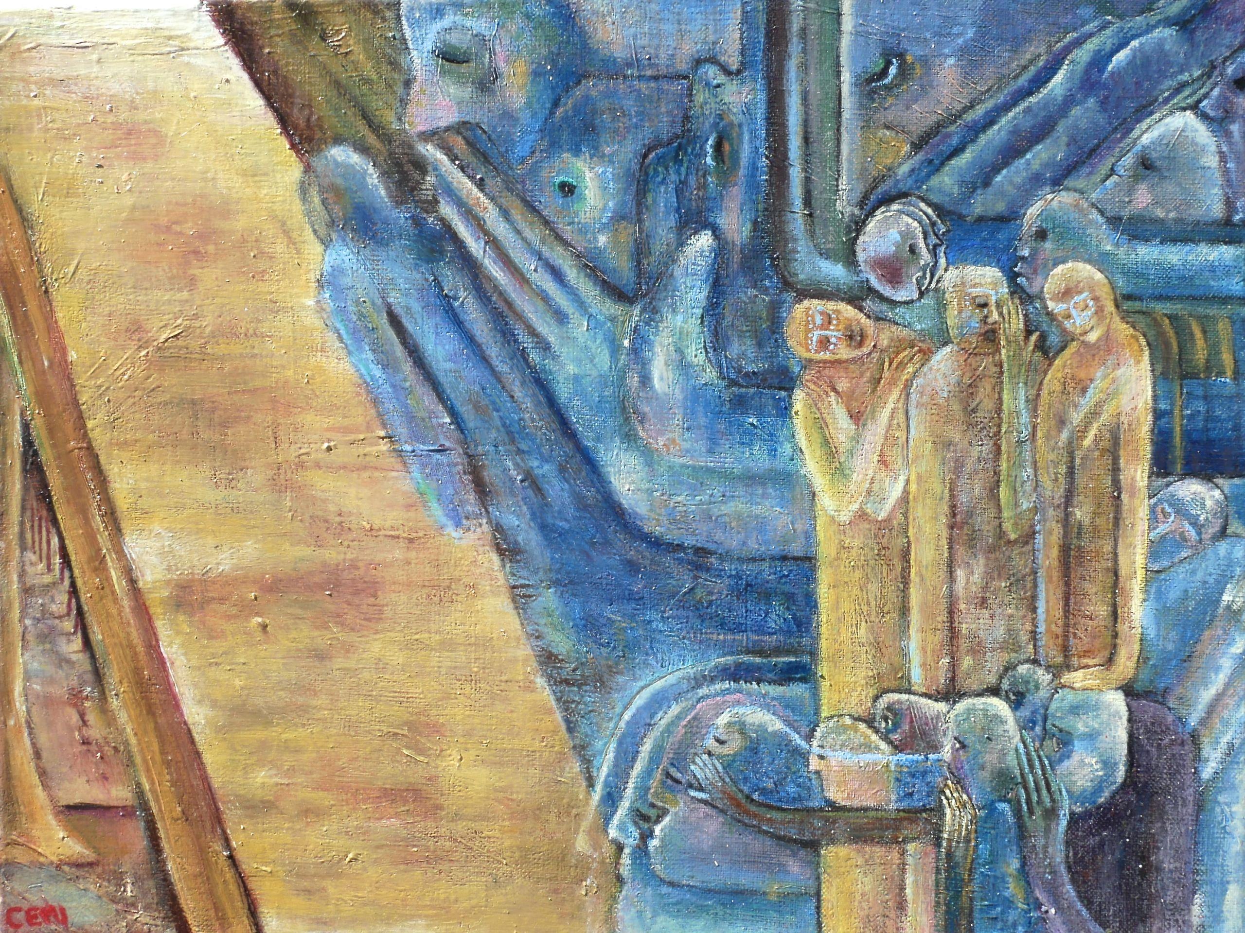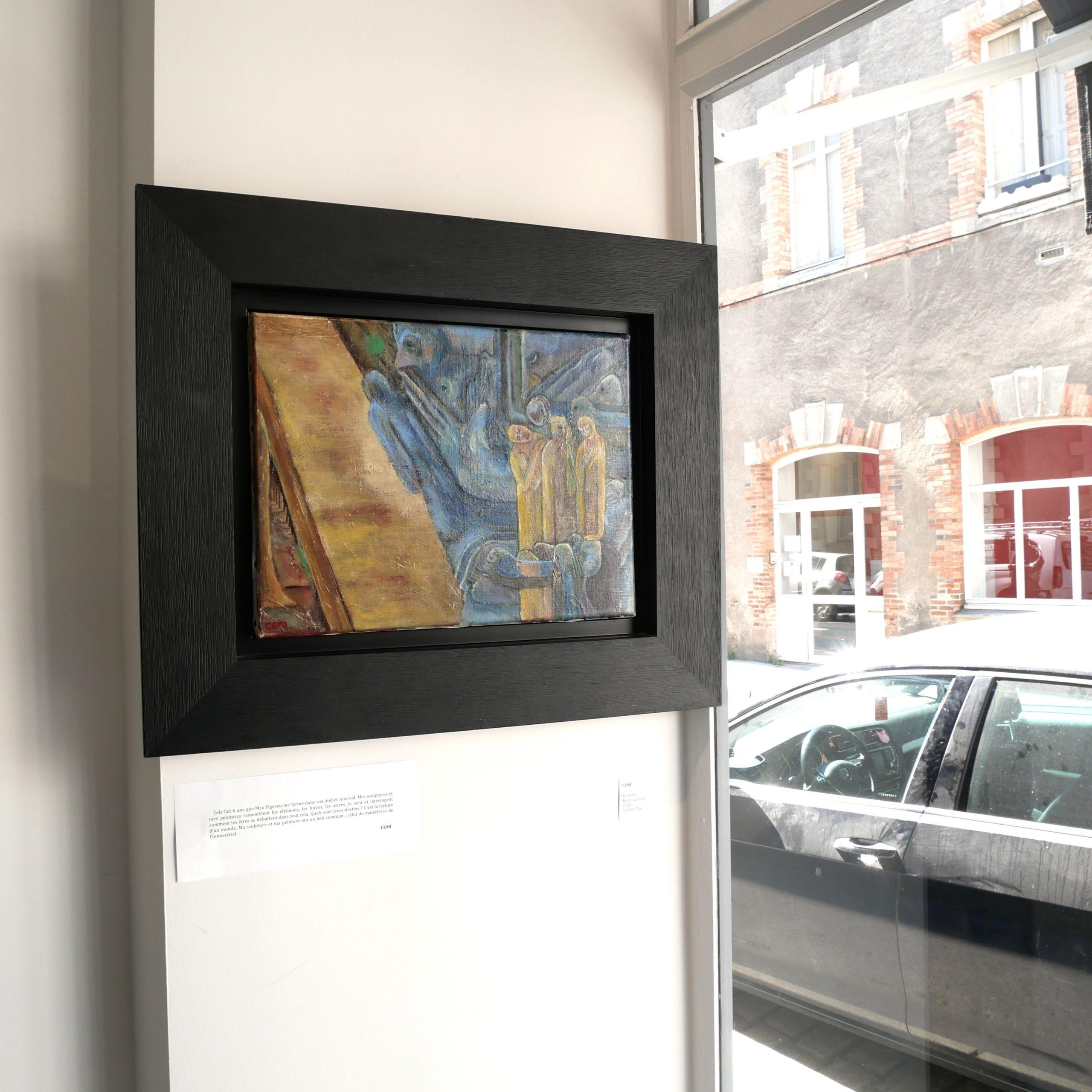 A secret circulates in this painting. It starts from the top right and travels between the elements. It passes through three mysterious characters; inspired by the three witches of Macbeth. It then flies up to the sky. Below left, a window; the one overlooking a forest, symbolizing a space located on our planet.