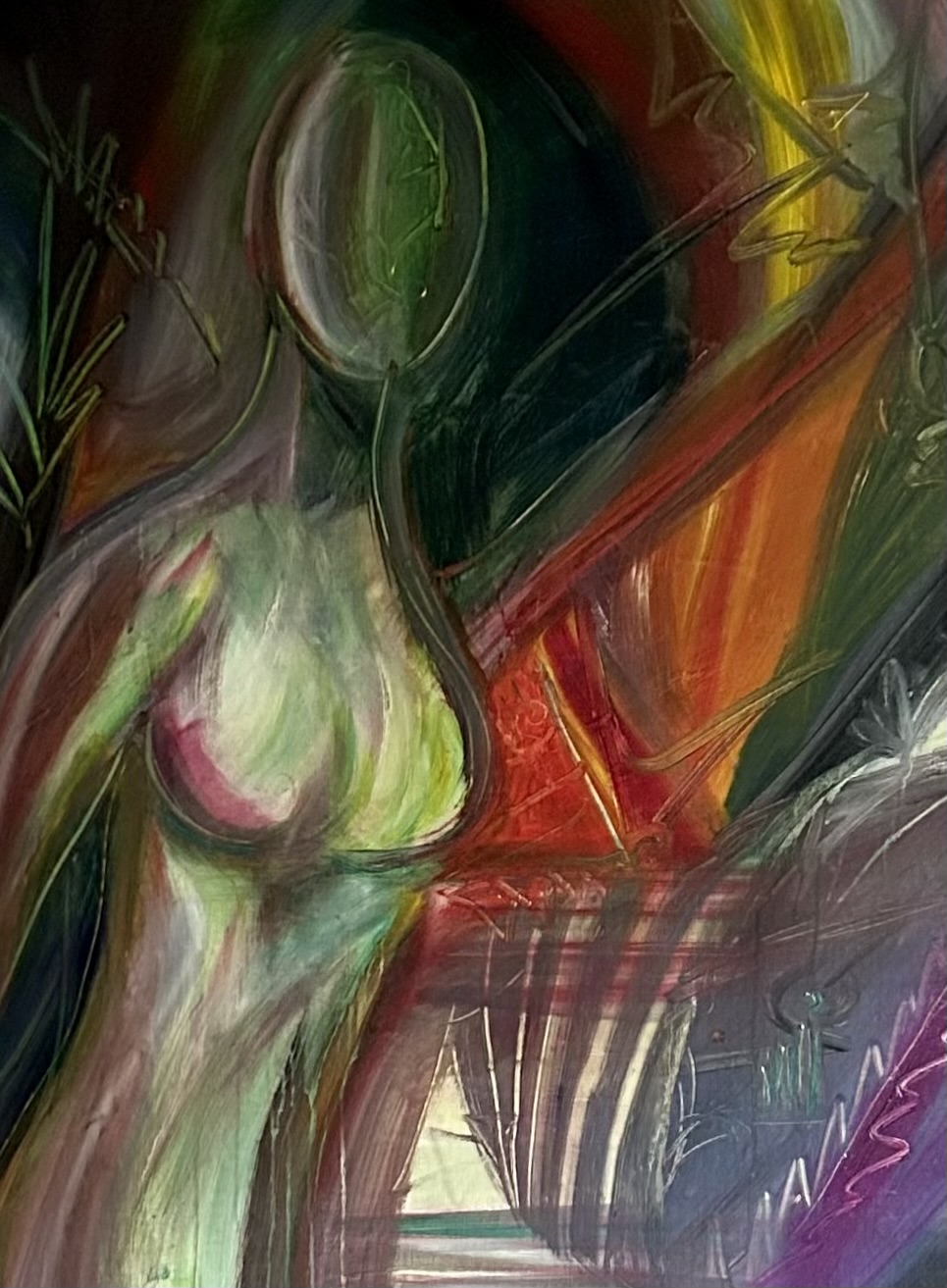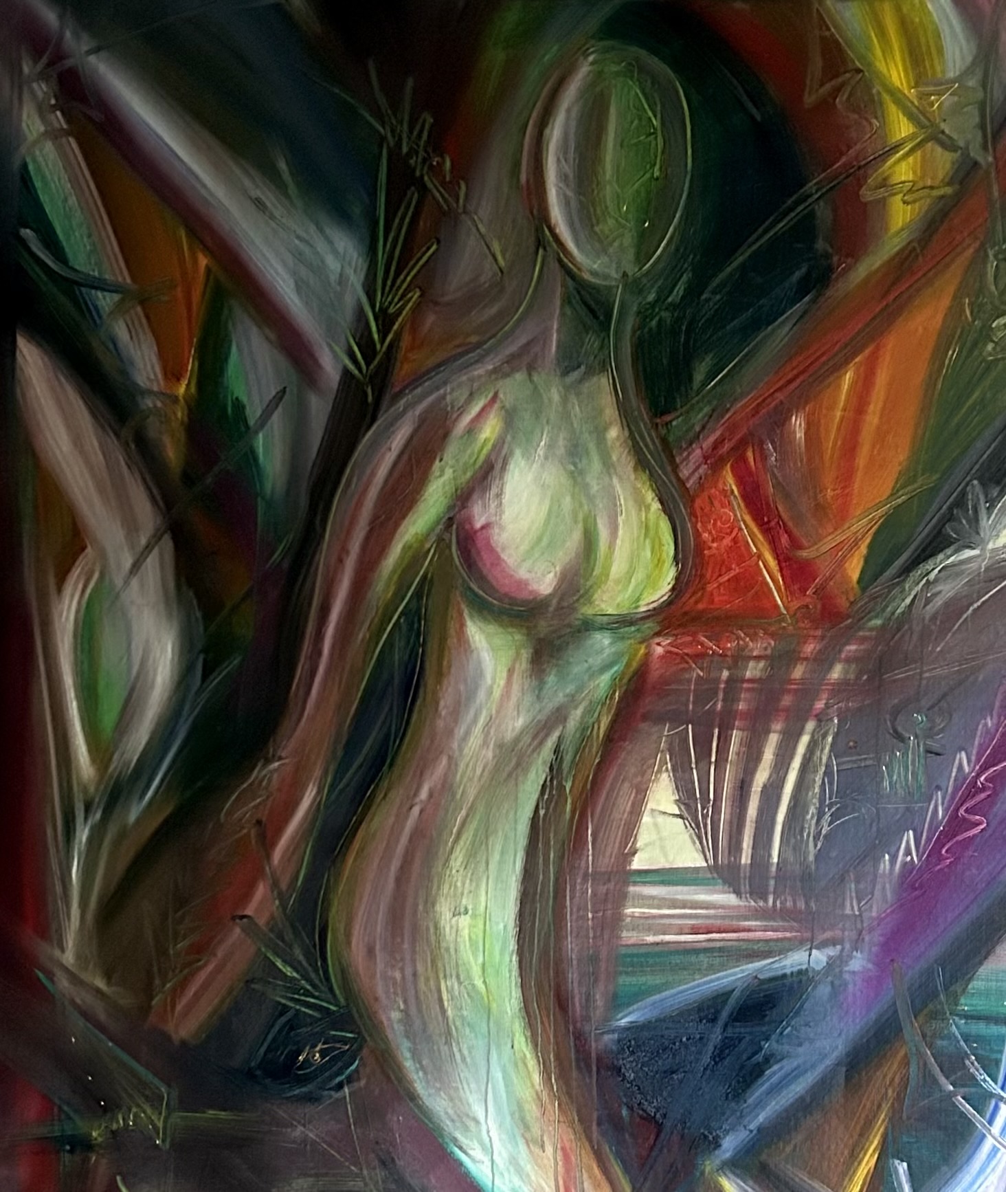 L’opera realizzata nel mese di agosto presso l’atelier di montagna rappresenta l’artista mentre osserva chi guarda l’opera in uno spazio astratto metafisico in cui le ombre e la luce giocano nel magico mistero della vita. The work created in August at the mountain atelier depicts the artist observing the viewer in a metaphysical abstract space where shadows and light play in the magical mystery of life.