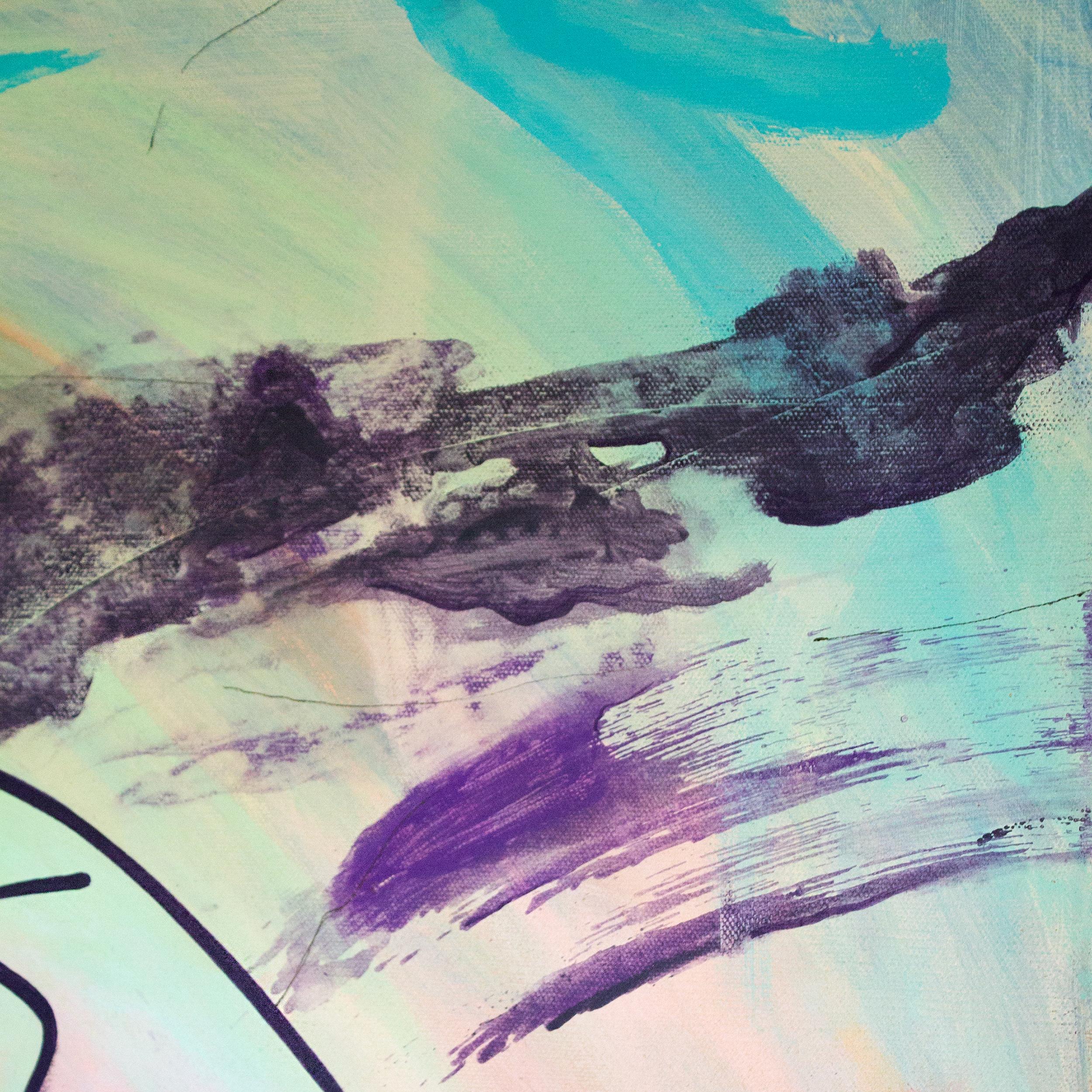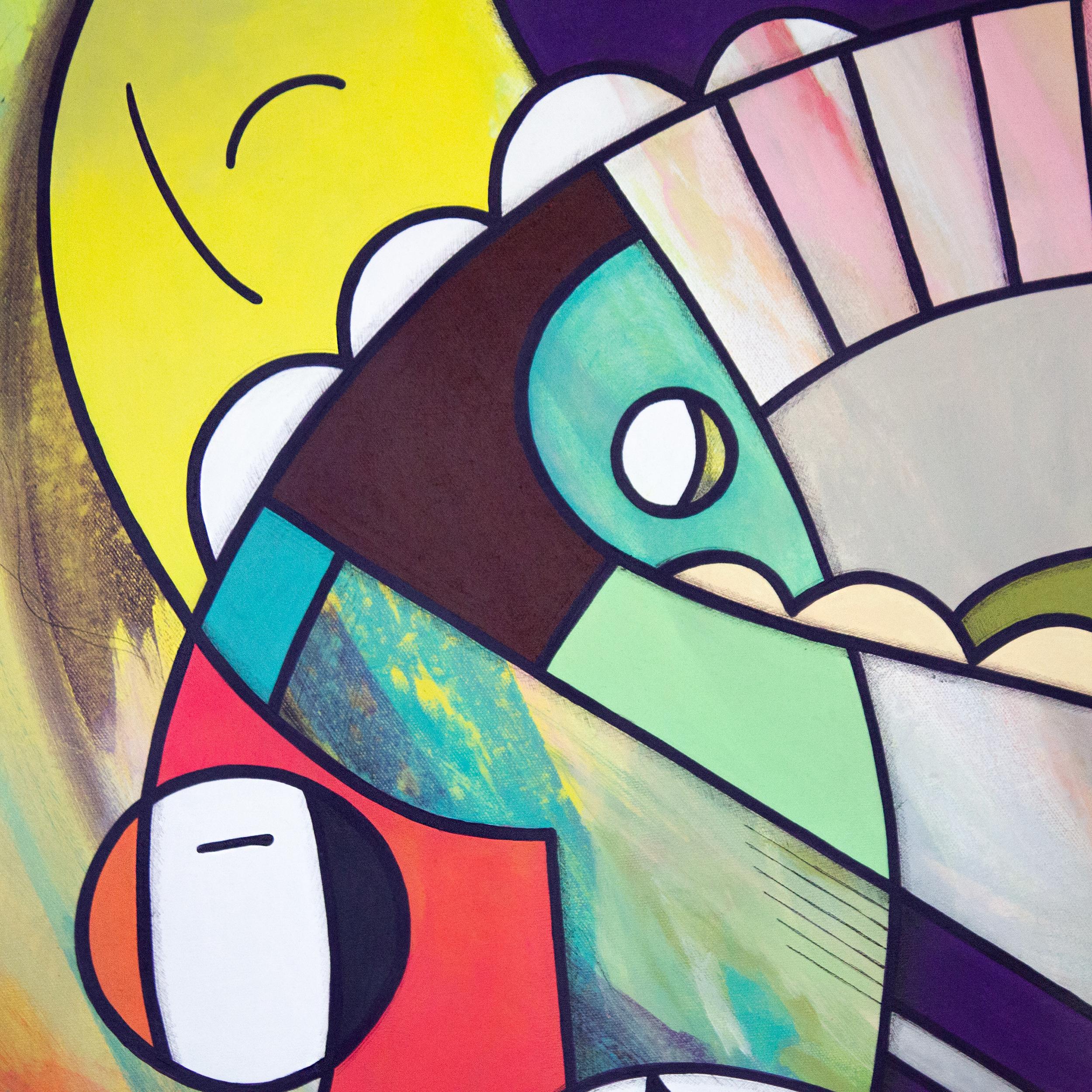 The background, with its fluid, shaded brushstrokes of bright tones, adds depth and movement in contrast to the sharper, flatter forms in the foreground, emphasizing the interplay between chaos and order, the visible and the hidden.