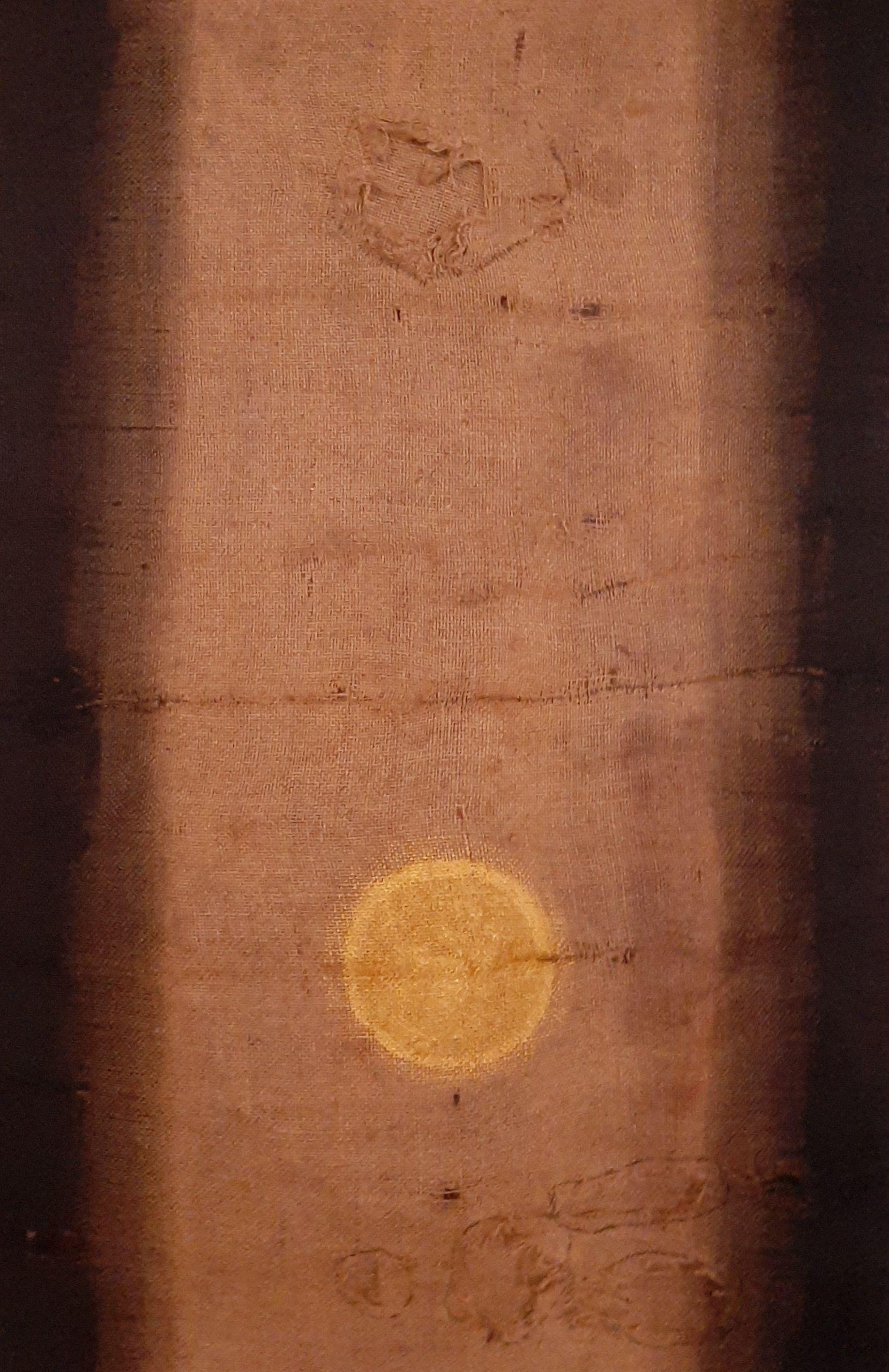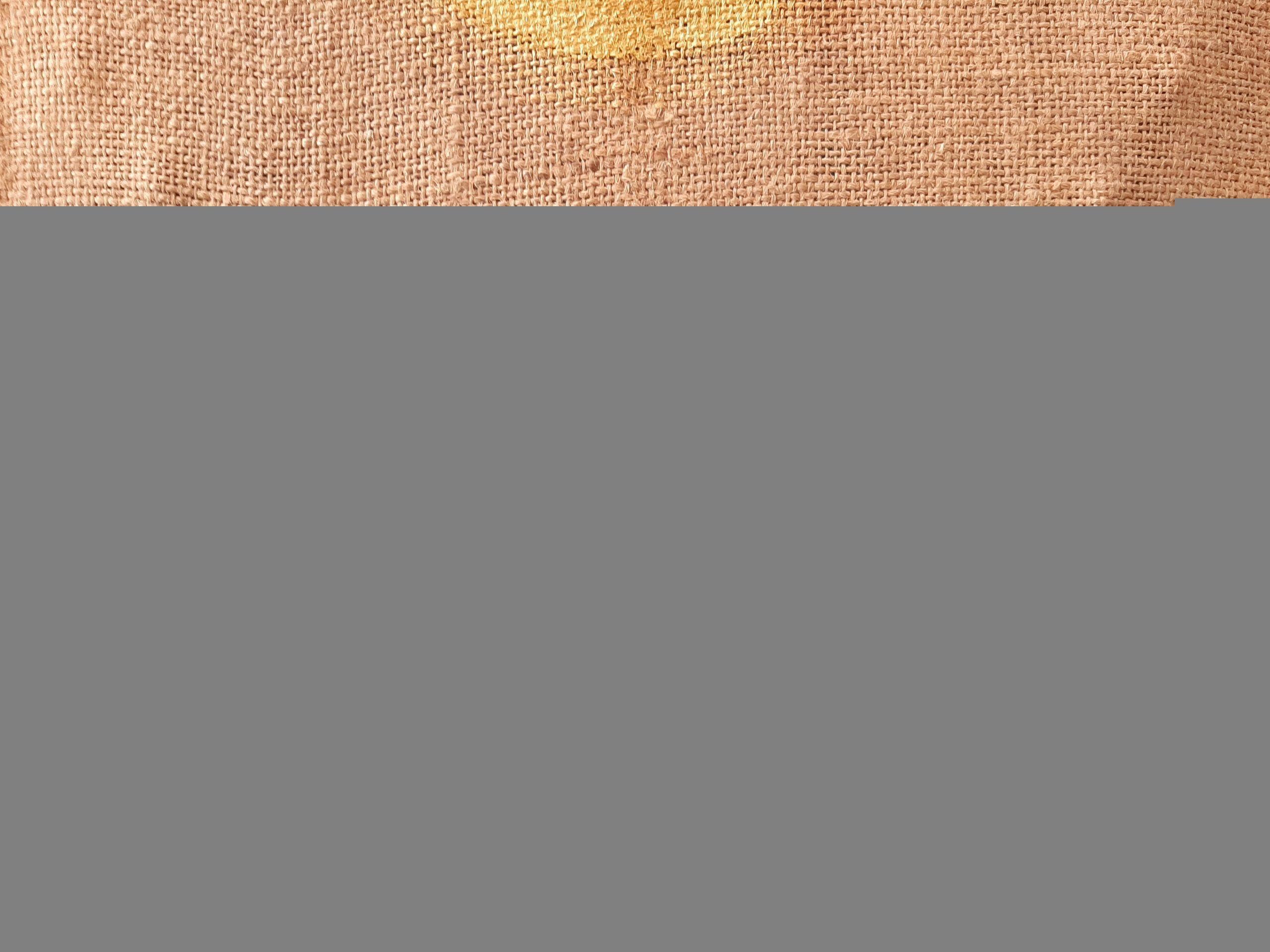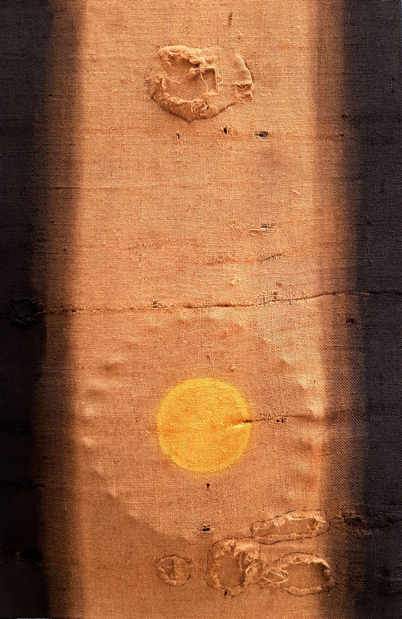Moterand child A natural jute sack used in a gagon mill mill, the fabric was laced with mill dust and injuries that had developed over time. With the warmth of home, the promise of bread, the imperfect surface of Mother, she completely embraces her child who appears on the common surface with the promise of the future. The natural jute sack has black matte enamel stripes on both sides, the extruding is visible only in the side light, while the whole surface is dominated by the child's golden disk.