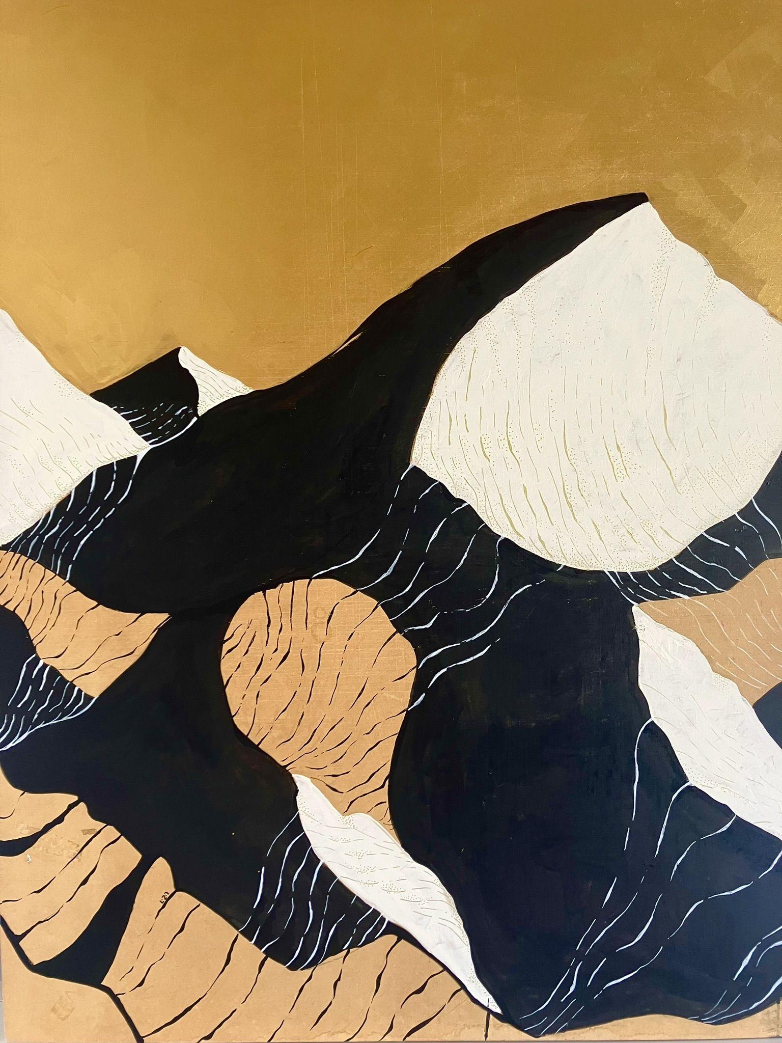 Minimalist dunes lanscape in black, white and gold. Acrylic on recicled wood. Focused on organic patterns found in nature. Special Recognition at Summer 555 art juried exhibition - las lagunas art gallery CA,2022