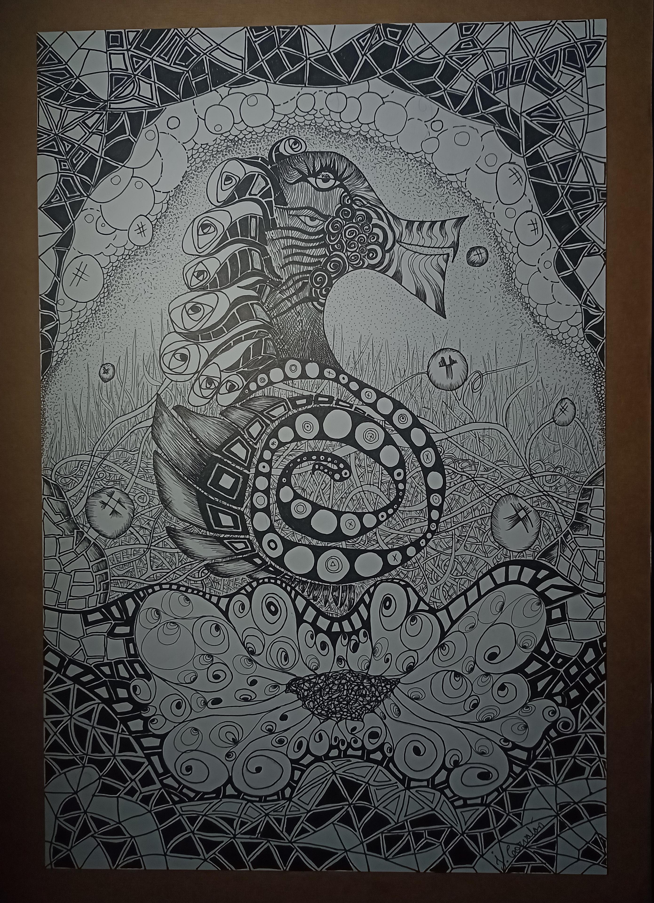 Textura en blanco y negro con una figura central donde es el interés del dibujo