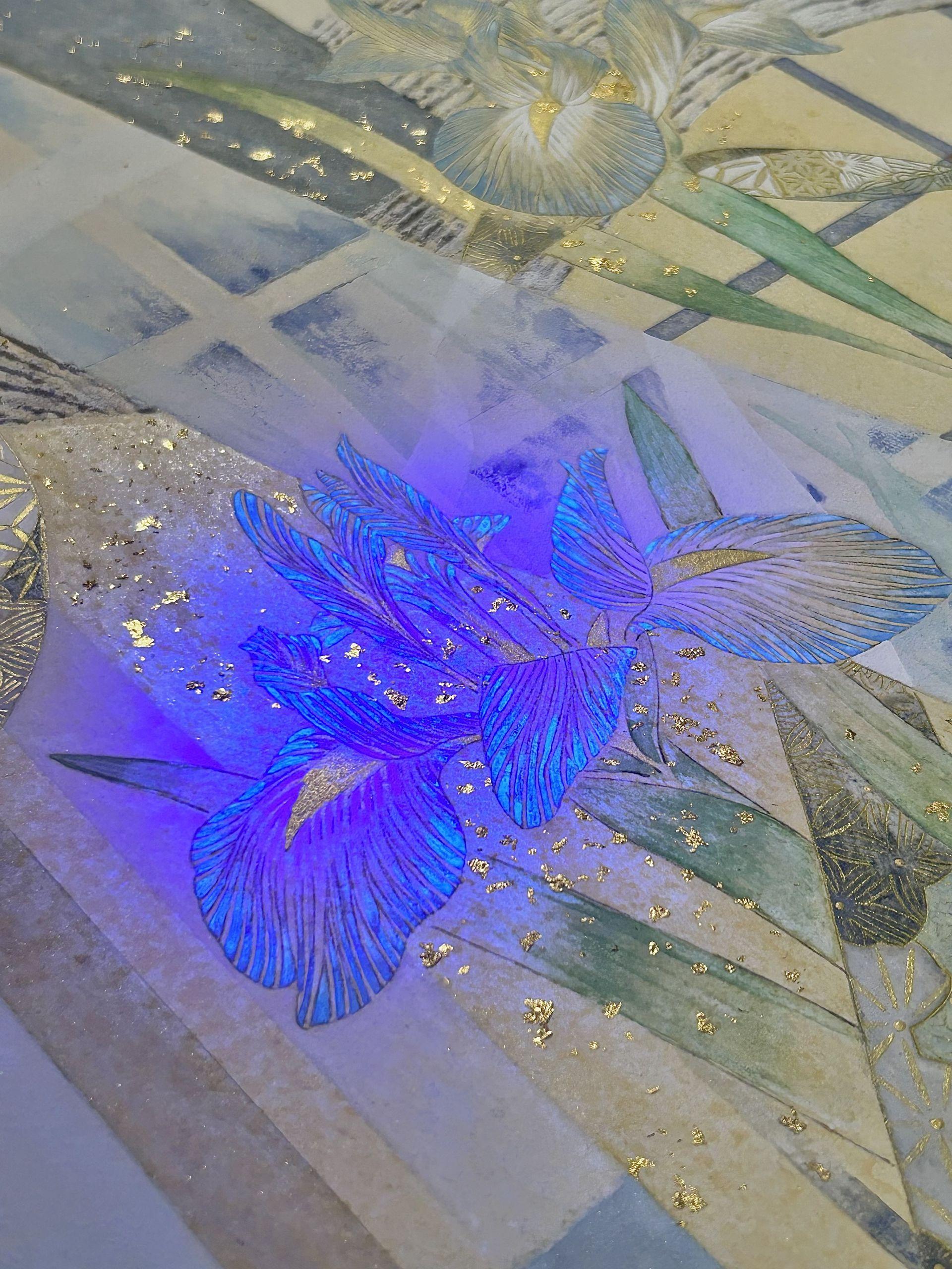 The temporal progression of the blossoms symbolizes the passing of time and life, simultaneously reflecting urban development and natural environmental evolution. Depending on the viewer's perspective, the change in seasons and natural rhythms are implied, and the use of white space conveys the sensation of a gentle breeze moving through the composition. The mineral properties of gouache allow the work to refract an array of colors, transforming with shifts in viewing angles and the passage of time. When night falls, turning off the lights reveals the natural fluorescence of the fluorite used in the artwork, casting a unique radiance in the darkness. This luminous effect adds a layer of mystery, symbolizing the cycle of light and darkness, the passage of time, and the delicate equilibrium between urban and natural realms, echoing the issues of modern urban culture and sustainable development. It encourages us to reevaluate our position in this complex world in terms of time, space, and self.