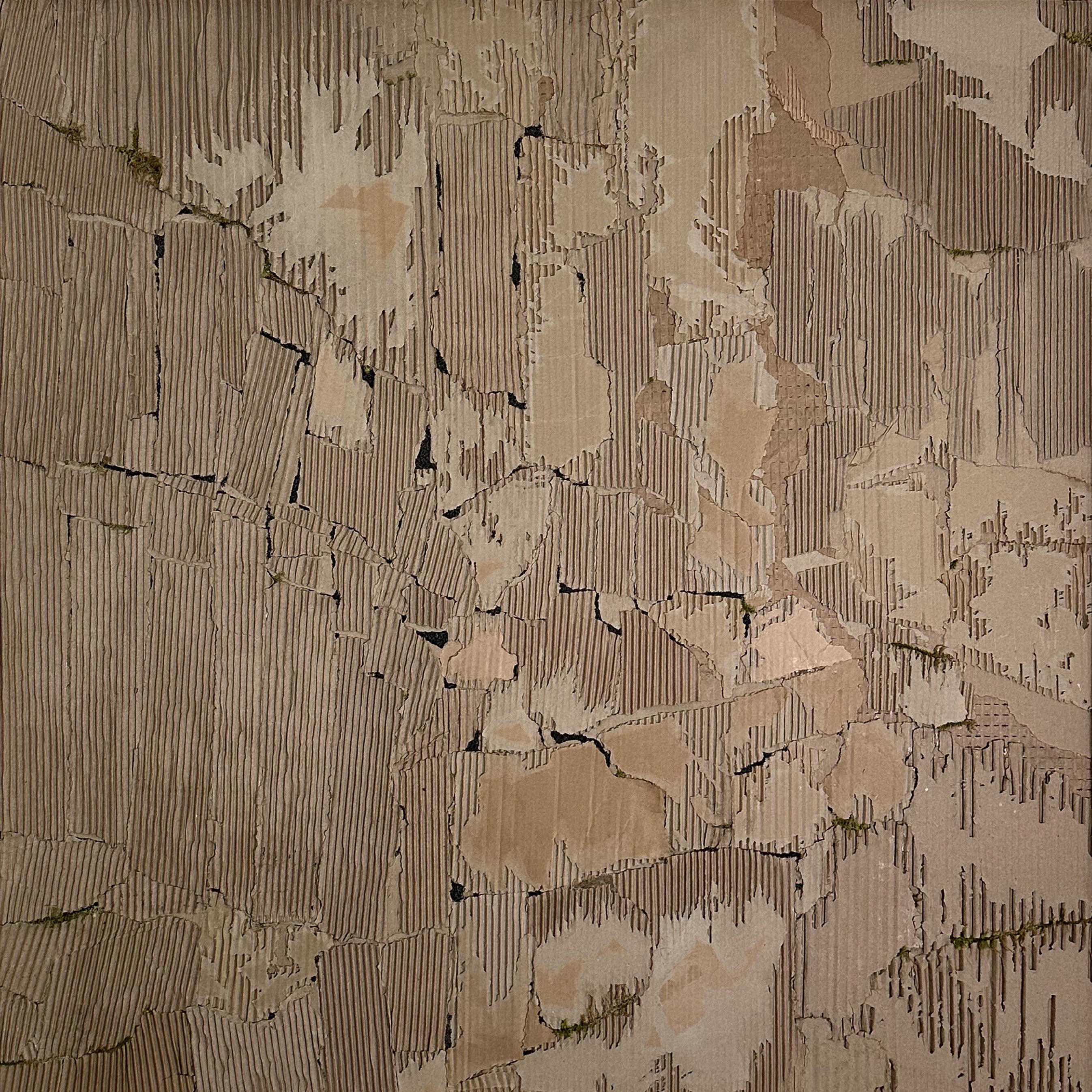The process begins with the recovery of packaging boxes: anonymous cardboard destined for recycling. The panels are torn decisively, revealing the internal “soul” of the material — overlapping layers, differing in texture and tone.
