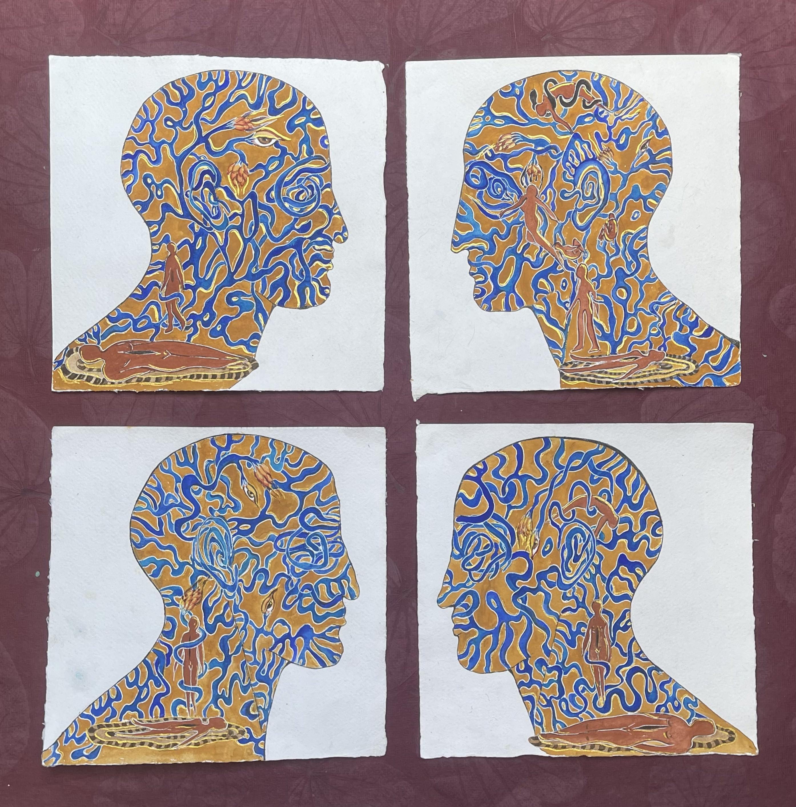 In "Prosopa," the artist employs a rich blend of abstract forms and symbolic imagery to explore the complexity of self and identity. The artwork feature an interplay of vivid colors, intricate textures, and dynamic shapes that converge to form a multifaceted representation of faces or masks. This approach reflects the varied and sometimes fragmented nature of personal identity.