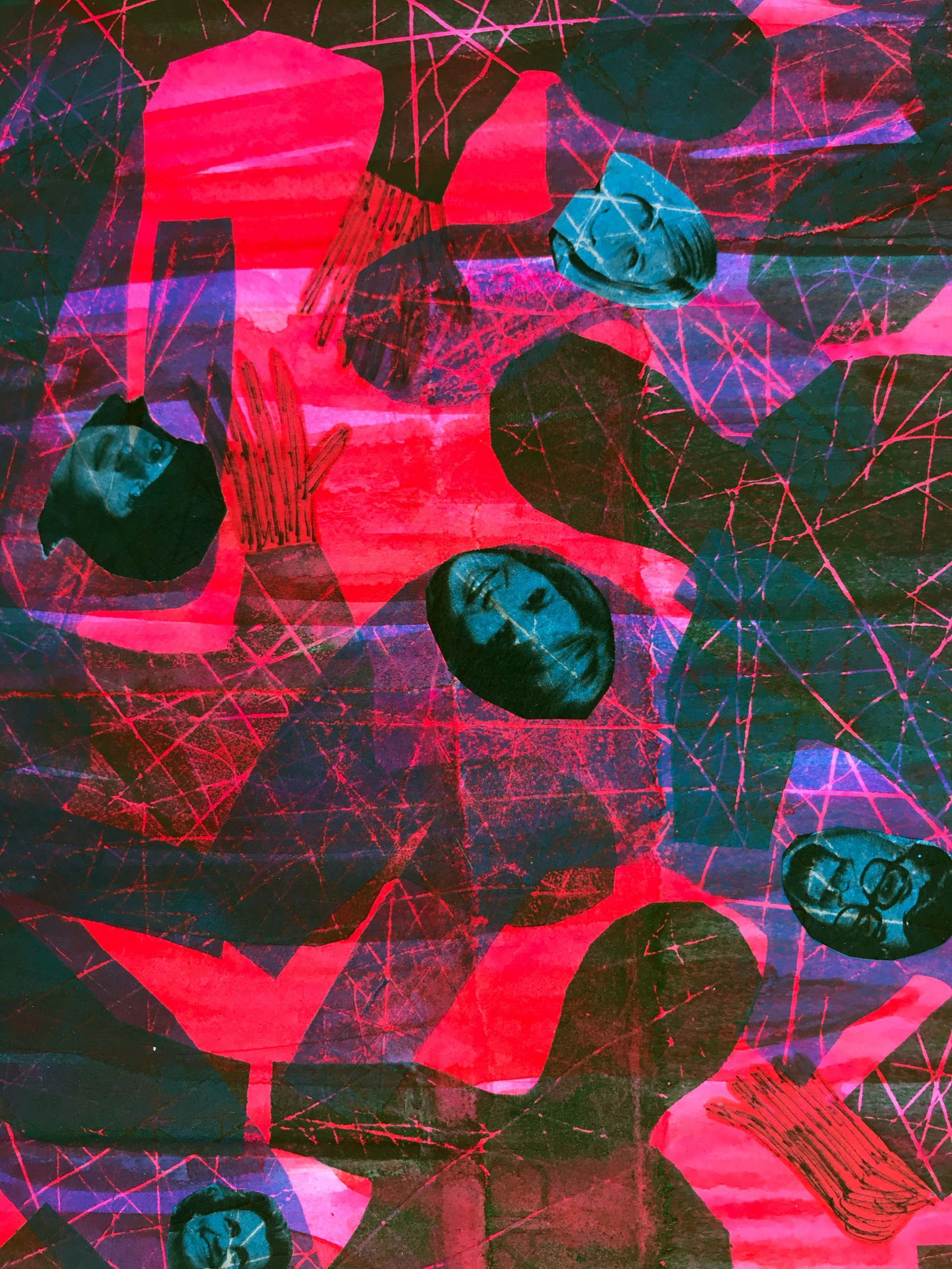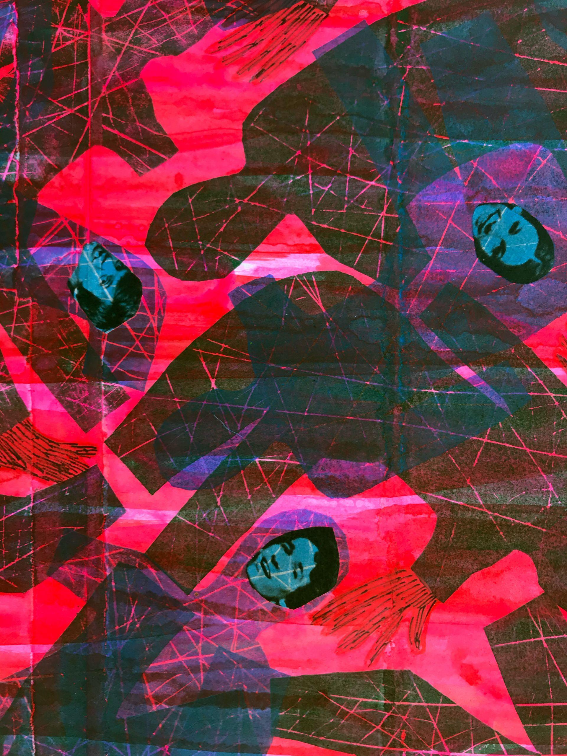 In this picture, people are less anonymous. There are heads, hands, and feet. However, these elements make silhouettes more readable, which contributes to the intensity of chaos. Their heads are apart from the bodies, hands and feet appear randomly, converted on a scale, and simplified. They complement the grid of scratches covering silhouettes, which are increasingly overlapping. Despite this increased physical closeness, people seem to continue to give accidental strength that impacts them together for a moment. It is a tiring state, full of anxiety, though they show smiling faces. The image shows the situation of disharmony and the discrepancy. This is what we often experience in the dominant capitalistic world where people choose to manage their individual concerns, hoping to find solutions to their private troubles. Where they have ceased to act collectively.