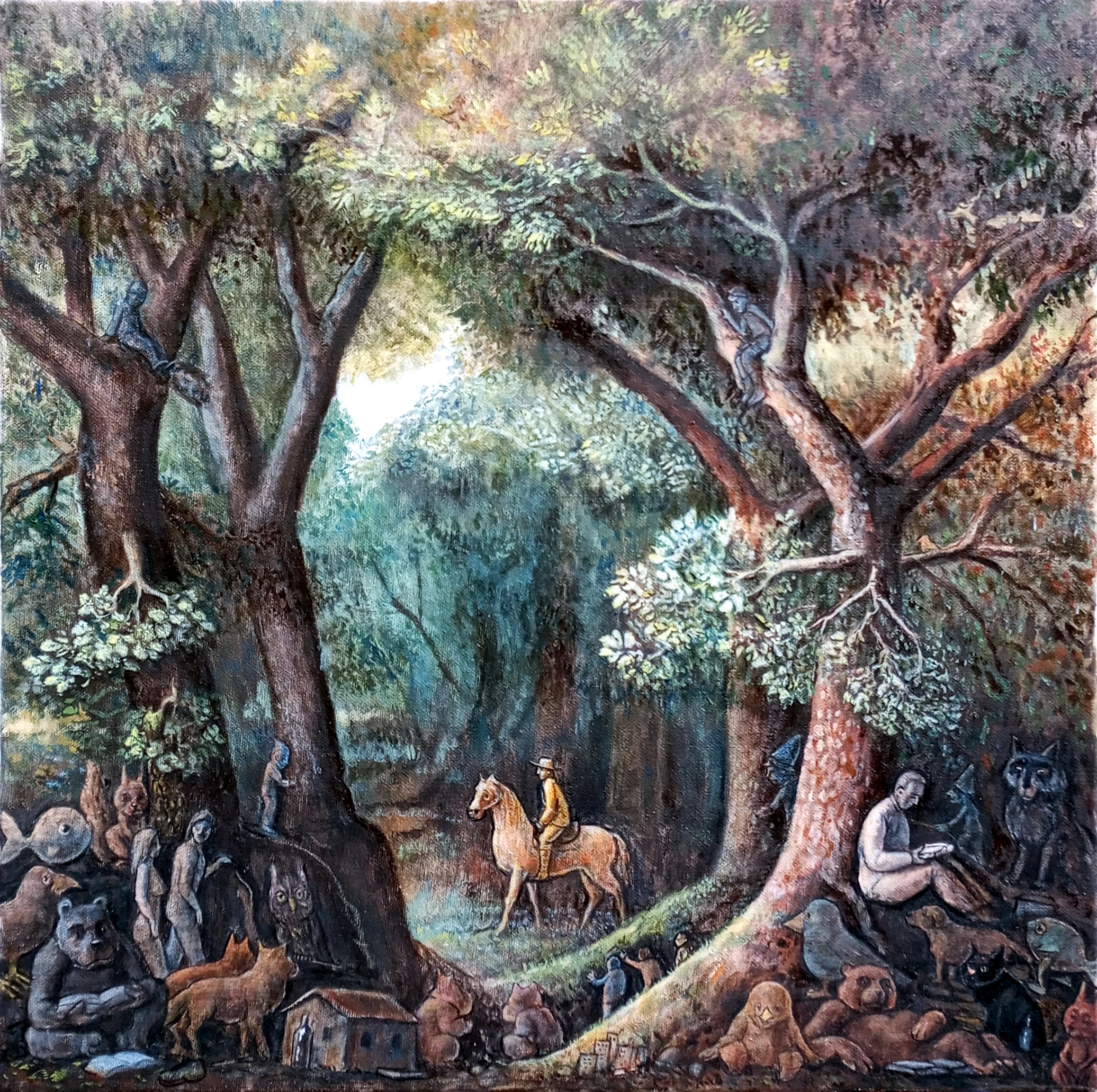 A man reading in the wood. Around him, many creatures. Maybe they come from the reader's imagination. Oil on canvas cm 50x50
