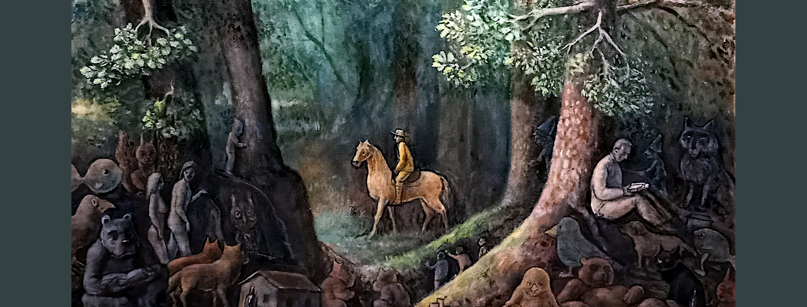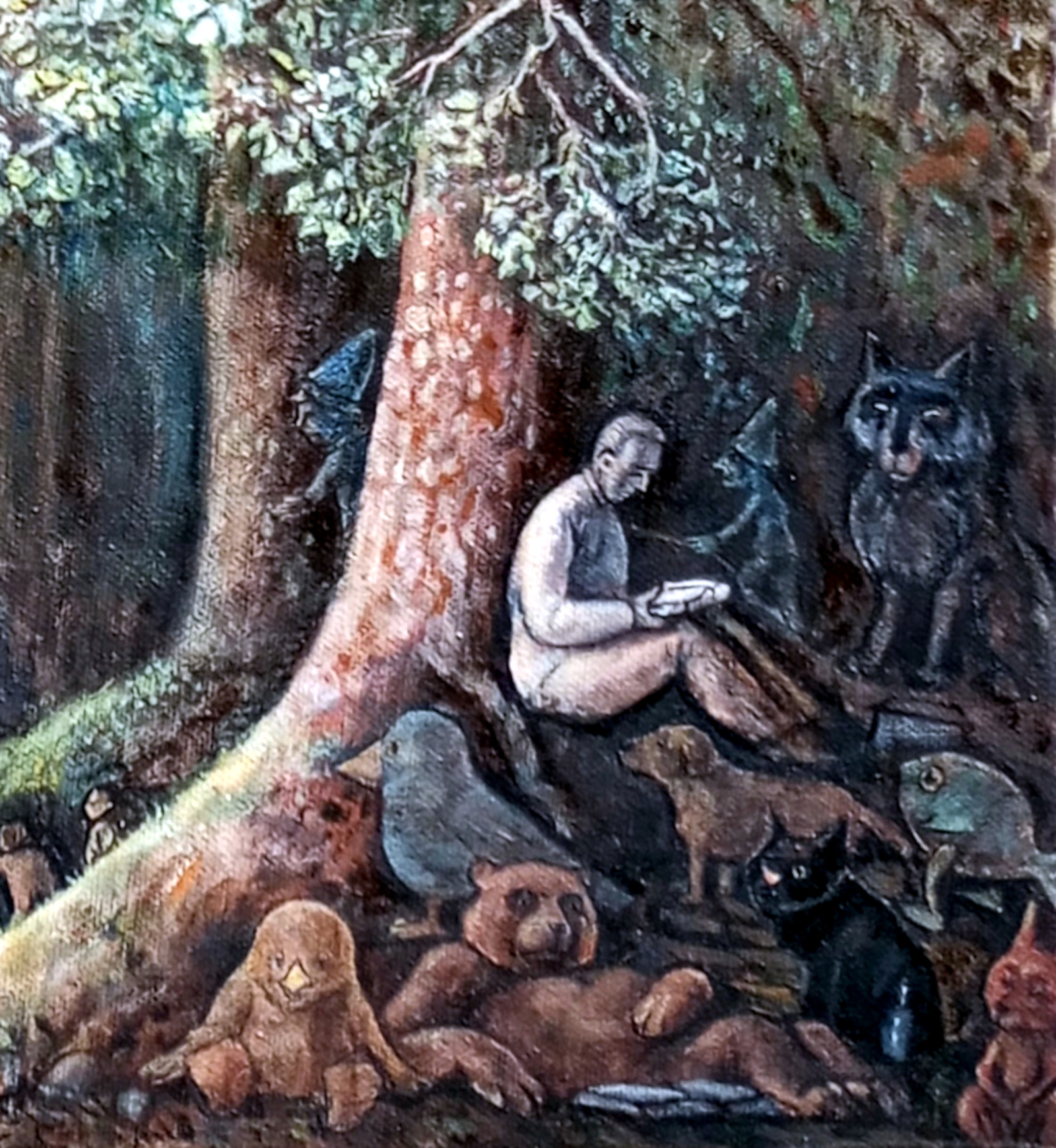 A man reading in the wood. Around him, many creatures. Maybe they come from the reader's imagination. Oil on canvas... Read More
