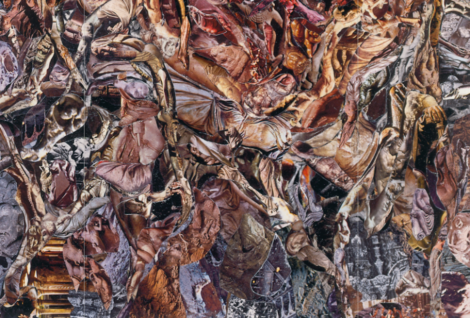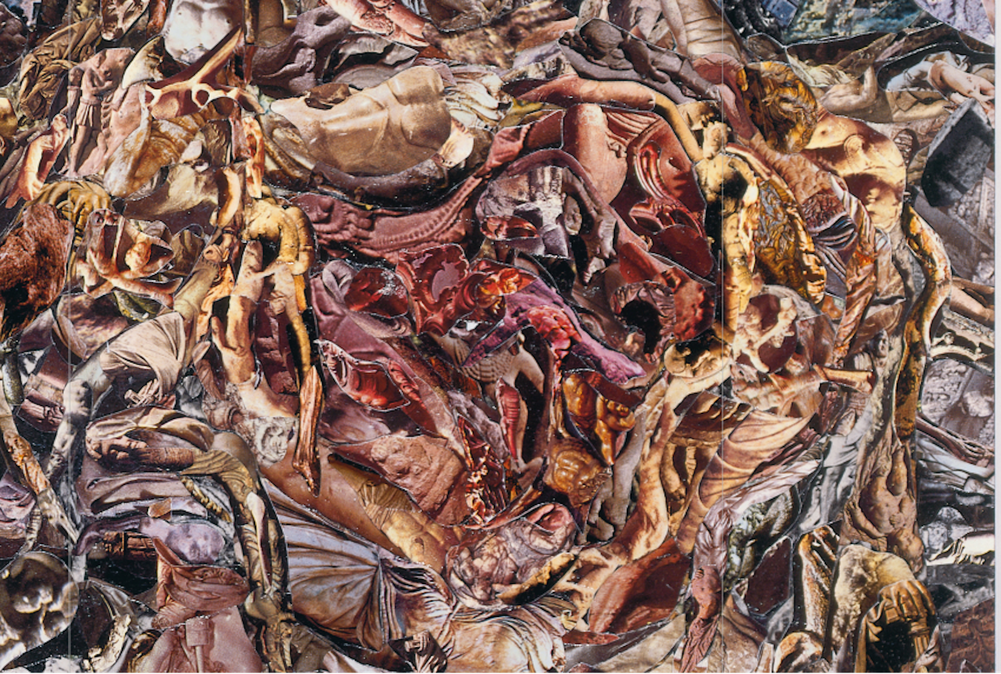 Junko sees the root as "struggling in a dark place." There is a muscularity and solidity to the root that required a constructive technique. The collage technique answered the need which the encounter with the root created. This image is a dense, surreal collage composed of interwoven human and animal forms, limbs, and organic textures. Rendered in earthy, flesh-like tones, the chaotic composition evokes a visceral sense of decay, transformation, and entanglement. The layered imagery suggests themes of mortality, the subconscious, and primal connections.