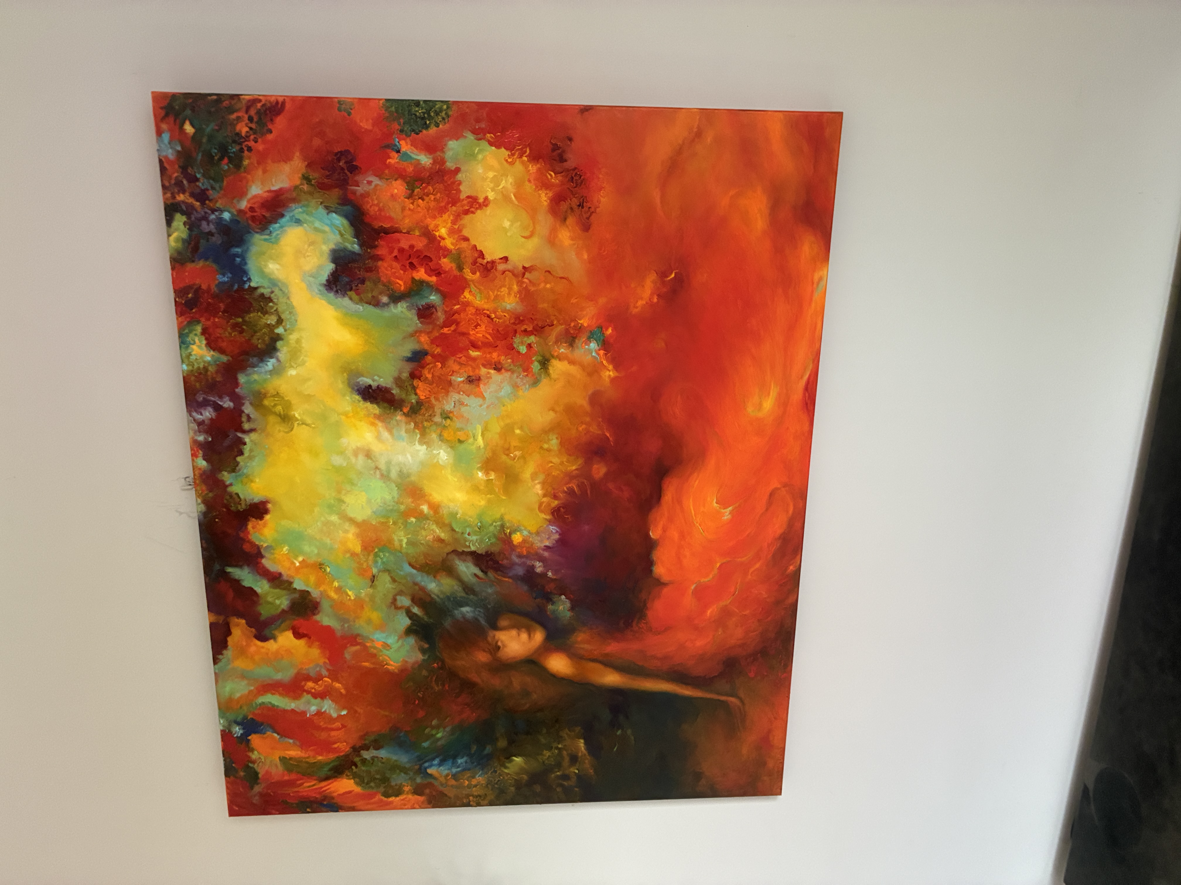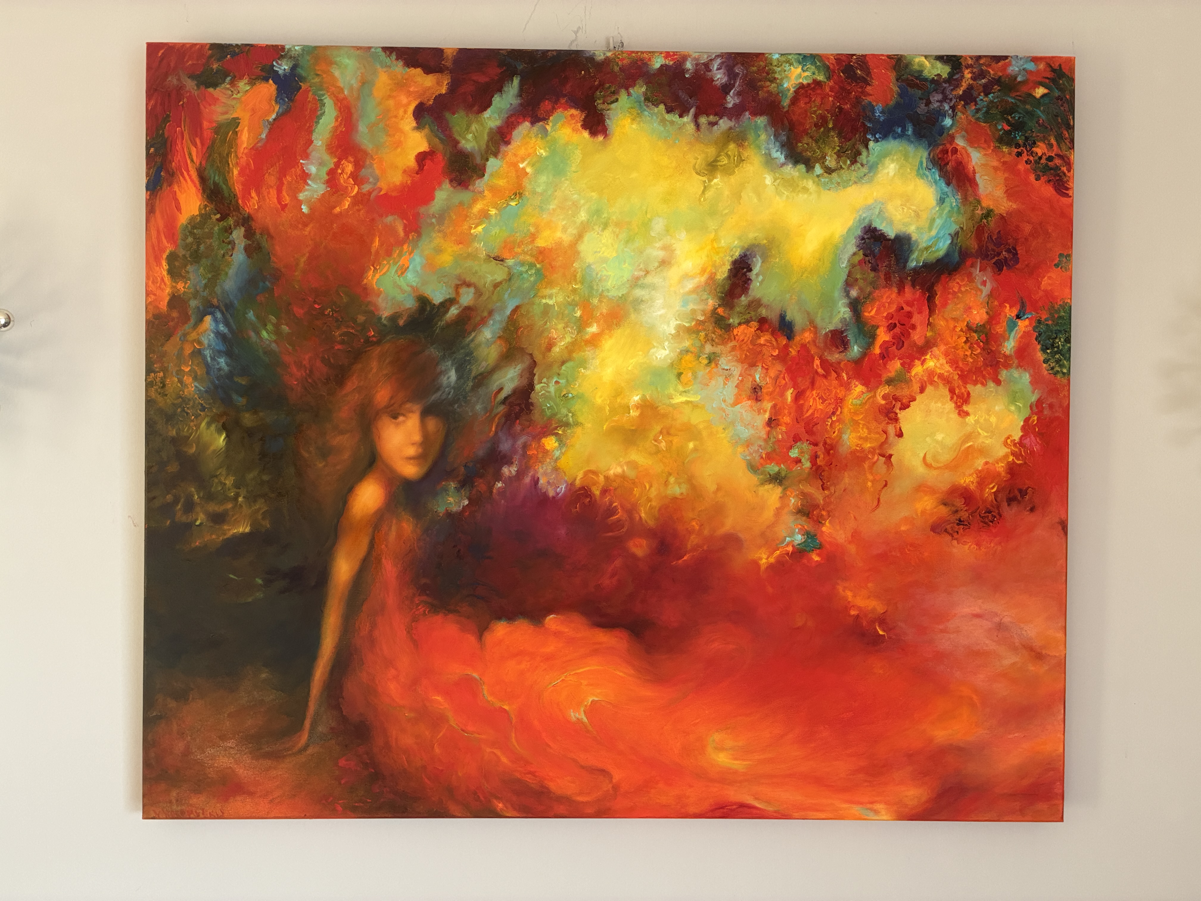 A figure holds at the edge of the image, while a charged field of colour unfolds around her —